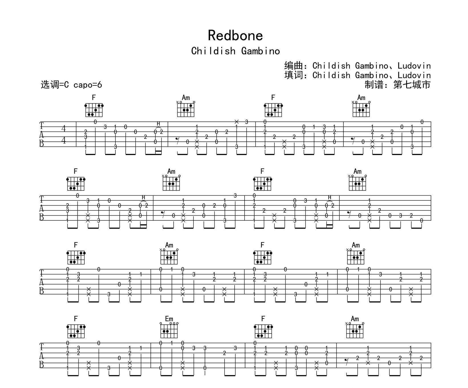 曲谱介绍: Redbone吉他谱,Childish Gambino演唱,Redbone吉他六线谱,共三张高清图片谱,本曲谱由第七城市编配制作,曲谱选用C调和弦,推荐变调夹6品,速度65BPM,适合入门的吉他玩家。