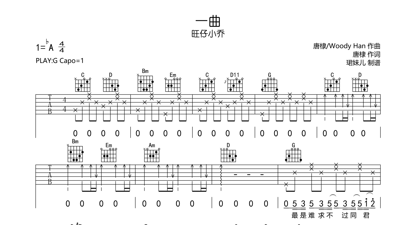 曲谱介绍: 旺仔小乔《一曲》吉他谱,由@珺妹儿制谱,《一曲》吉他弹唱谱,共三张图片谱,本谱采用G调指法编配,原调bA,弹唱建议变调夹1品,速度85BPM,节奏4/4拍,难度较简单,易上手。
