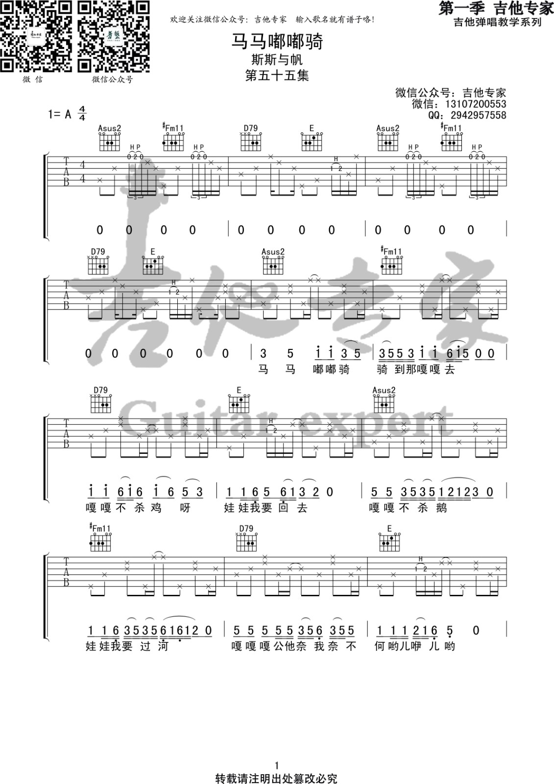 马马嘟嘟骑吉他谱 - 附前奏 - A调吉他弹唱谱