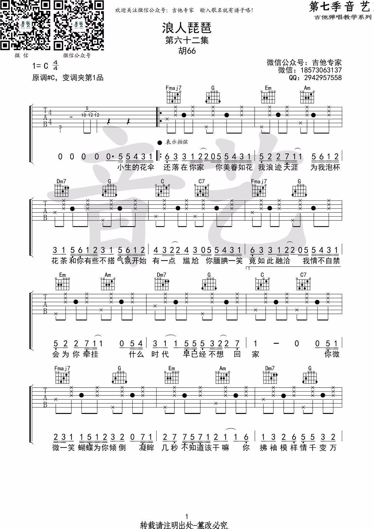 浪人琵琶吉他谱 - 胡66 - C调吉他弹唱谱