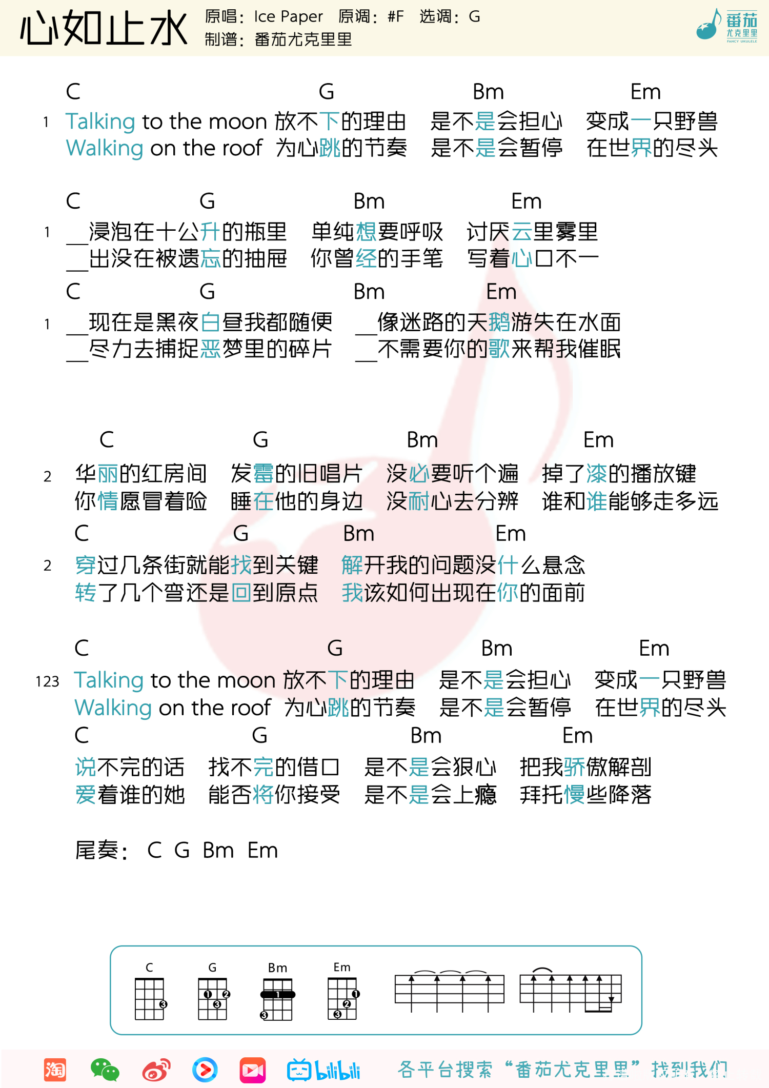 曲谱介绍: Icepaper《心如止水》尤克里里谱,共有1张高清图谱,免翻页排版设计。