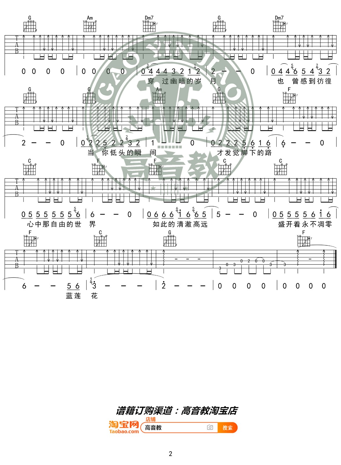 曲谱介绍: 许巍《蓝莲花》吉他弹唱谱,采用C调指法编配,高音教编配出品,共有2张高清图谱,免翻页排版设计。