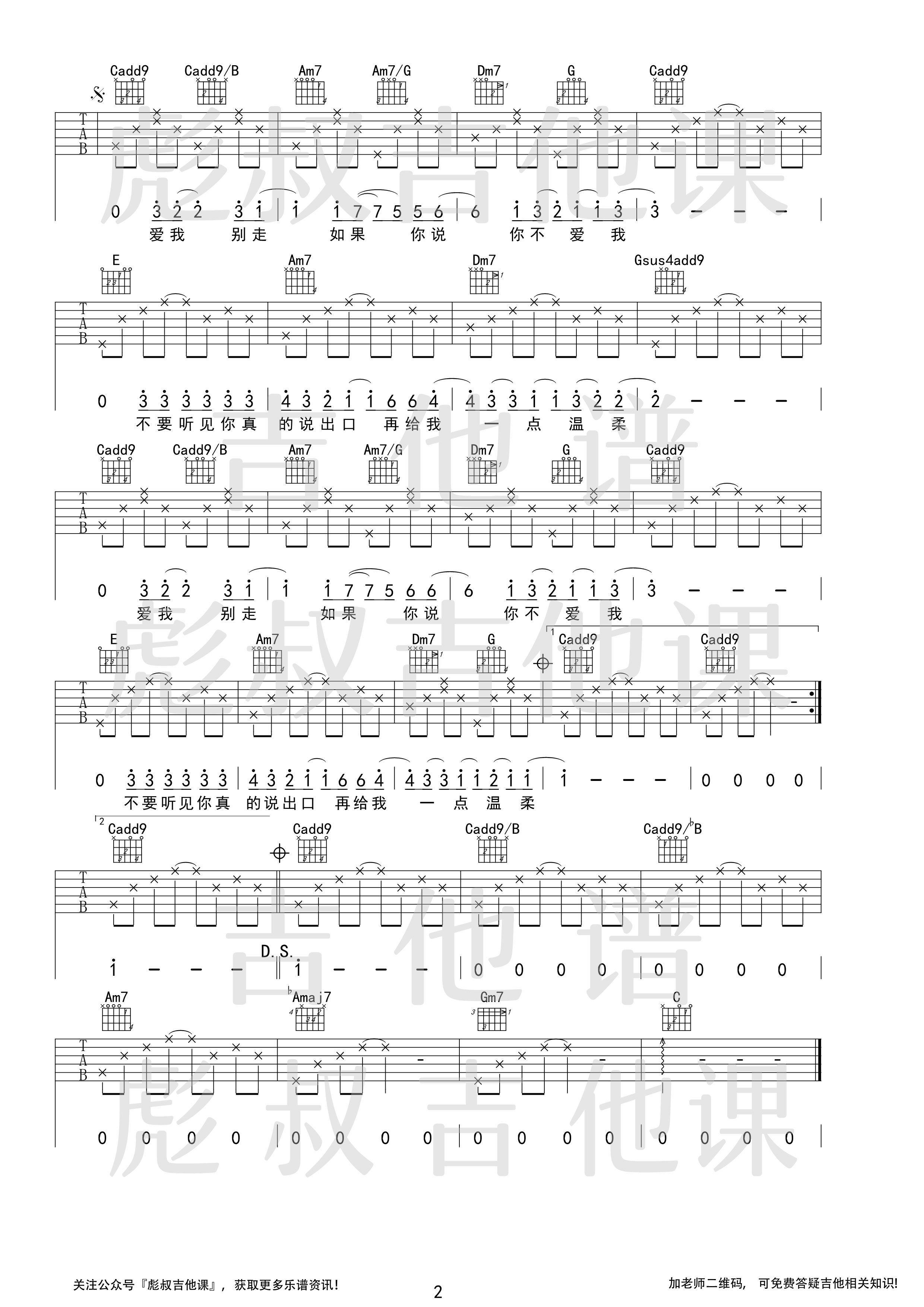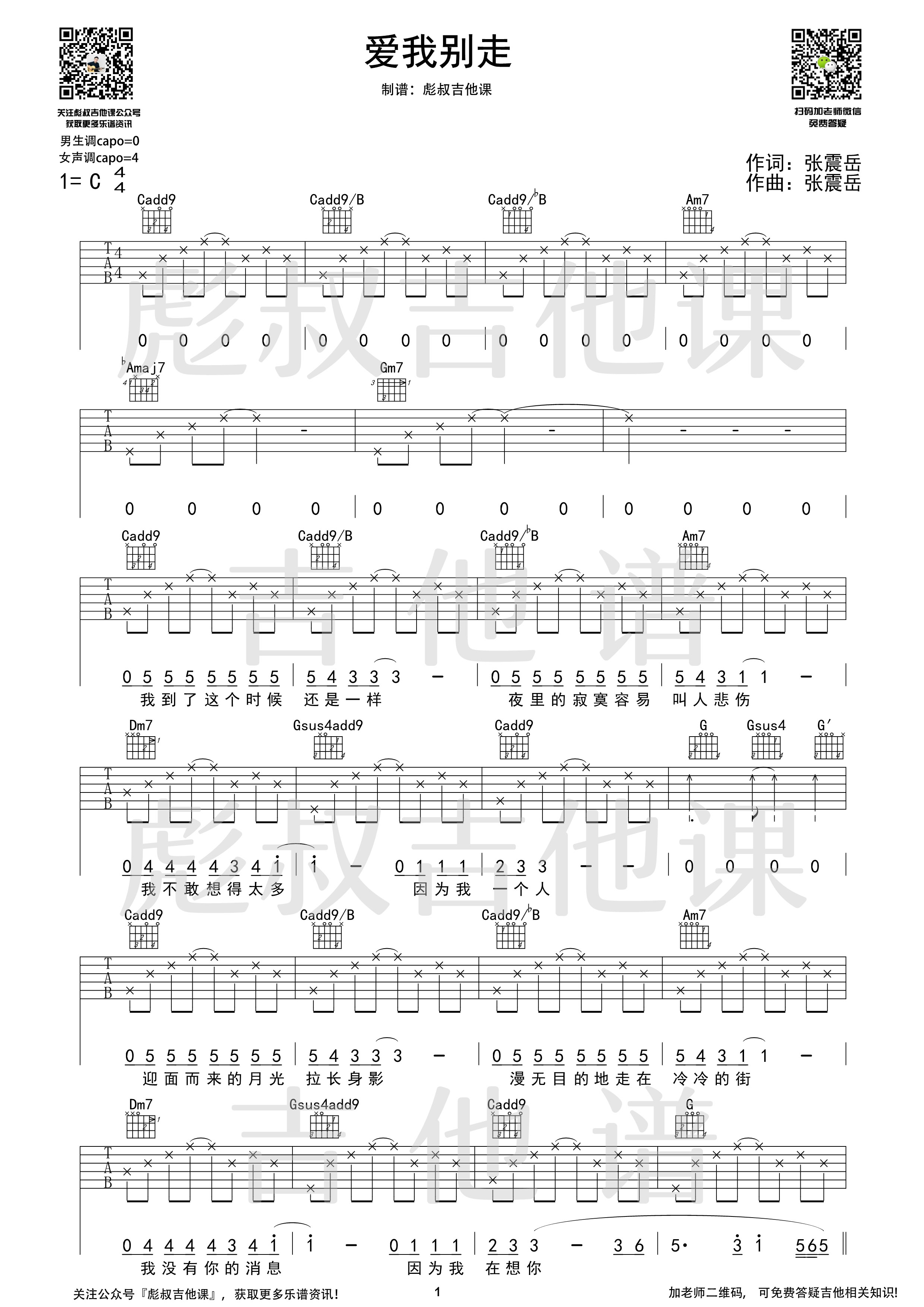 曲谱介绍: 张震岳《爱我别走》吉他弹唱谱,采用C调指法编配,共有2张高清图谱,免翻页排版设计。