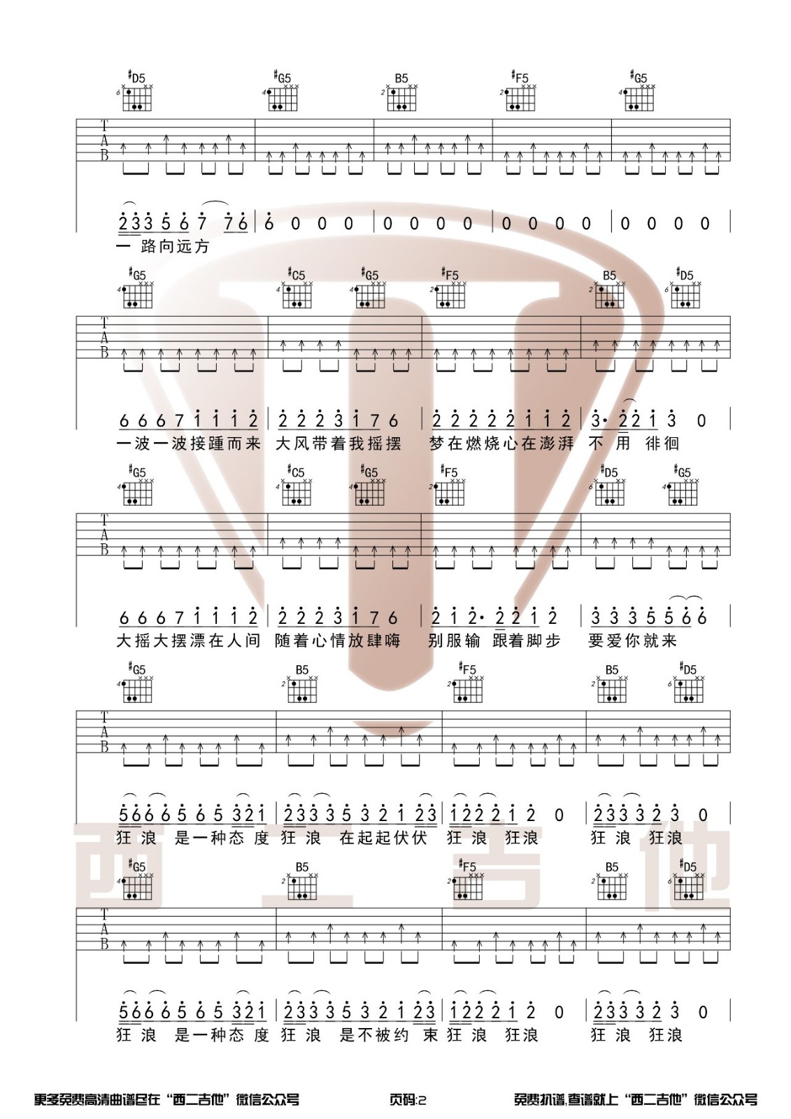 曲谱介绍: 花姐《狂浪》吉他弹唱谱,采用B调指法编配,西二吉他编配出品,共有3张高清图谱。