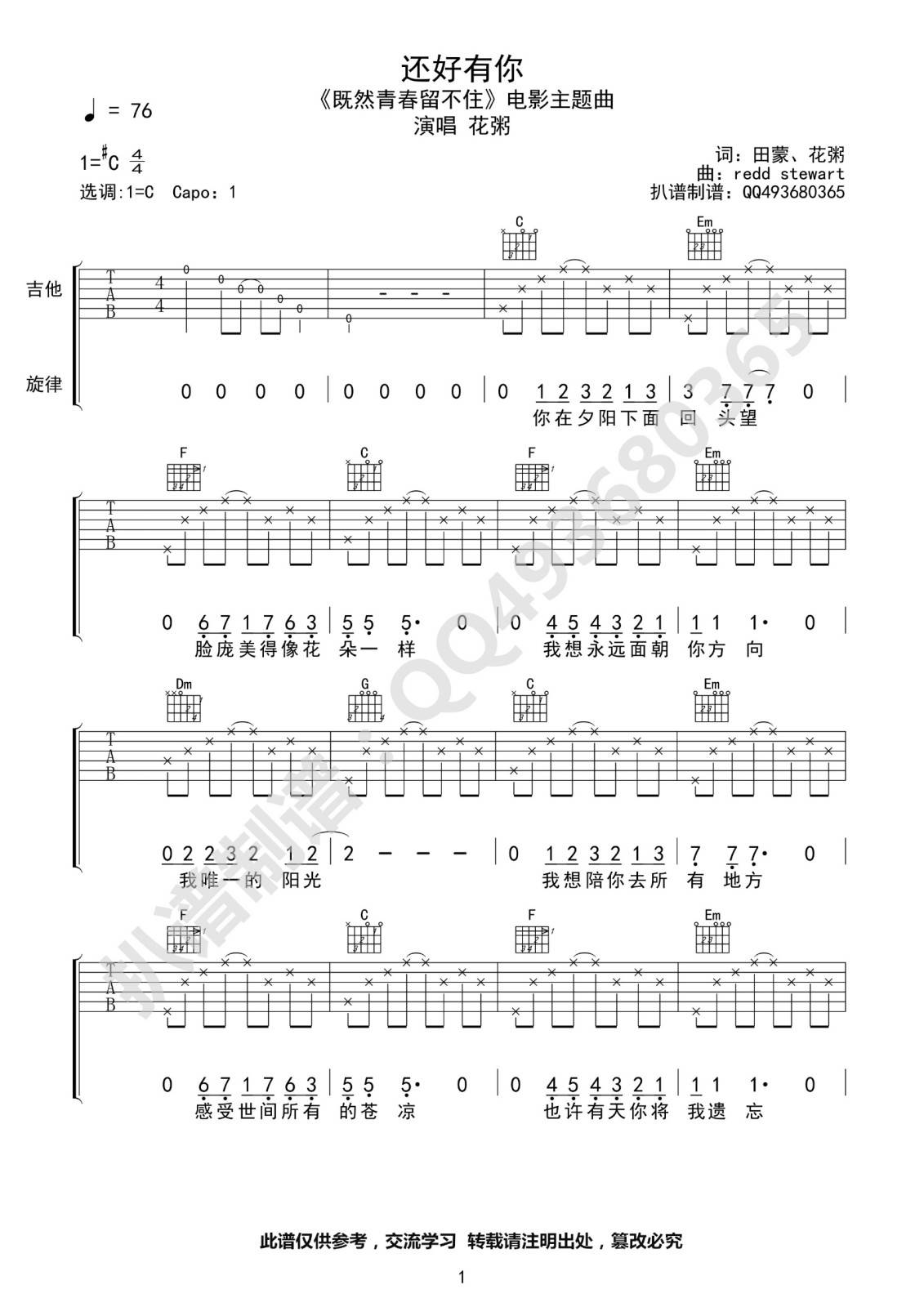 曲谱介绍: 品冠《还好有你》吉他弹唱谱,采用C调指法编配,共有2张高清图谱,免翻页排版设计。