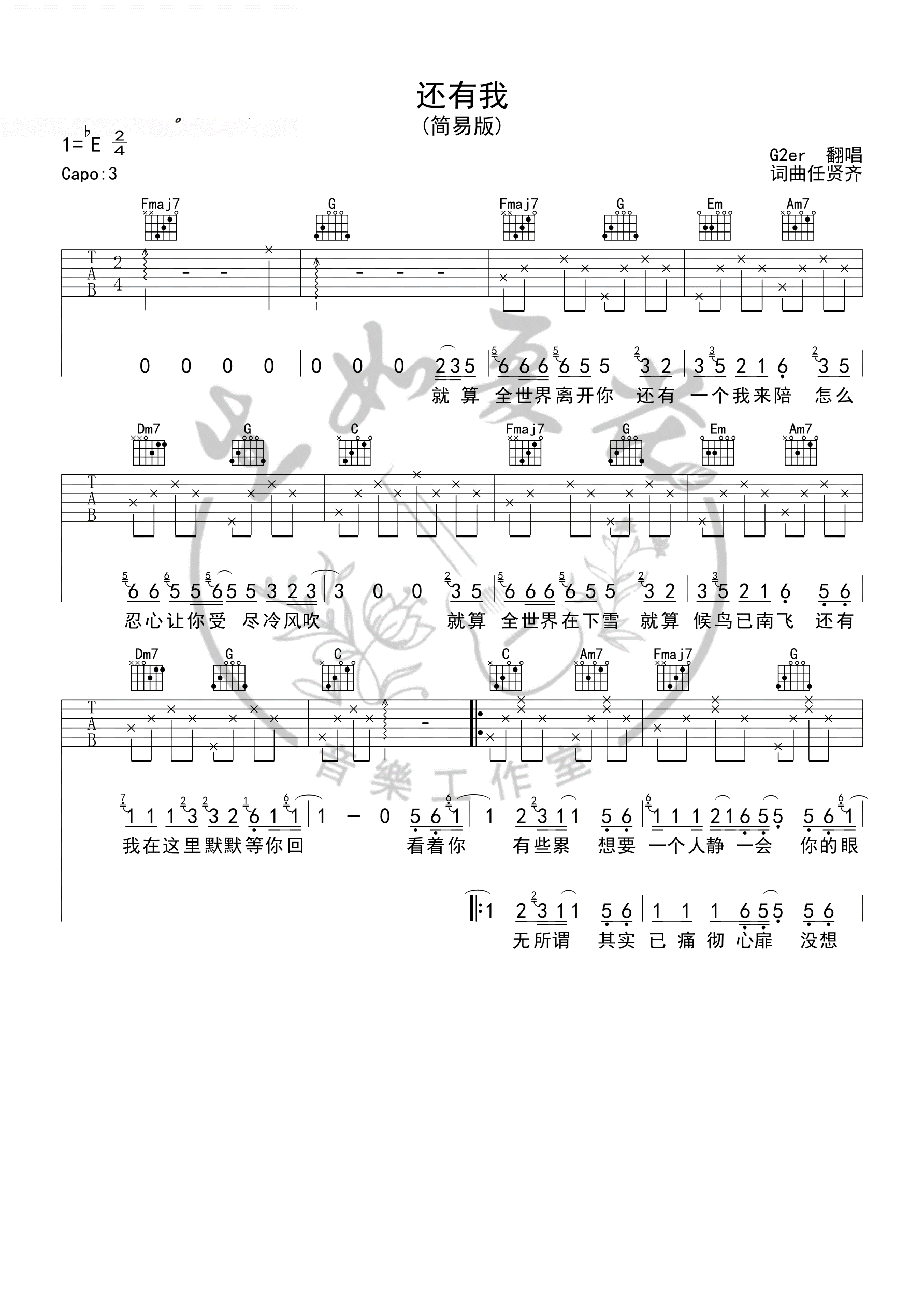 曲谱介绍: 任贤齐/G2er《还有我》吉他弹唱谱,采用C调指法编配,生如夏花音乐工作室编配出品,共有2张高清图谱,免翻页排版设计。