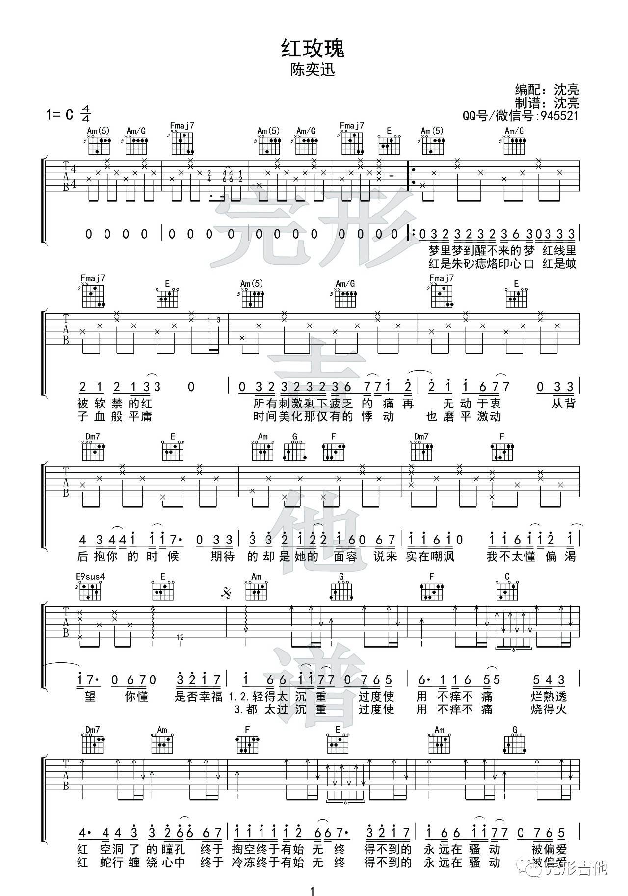曲谱介绍: 陈奕迅《红玫瑰》吉他弹唱谱,采用C调指法编配,完形吉他编配出品,共有2张高清图谱,免翻页排版设计。