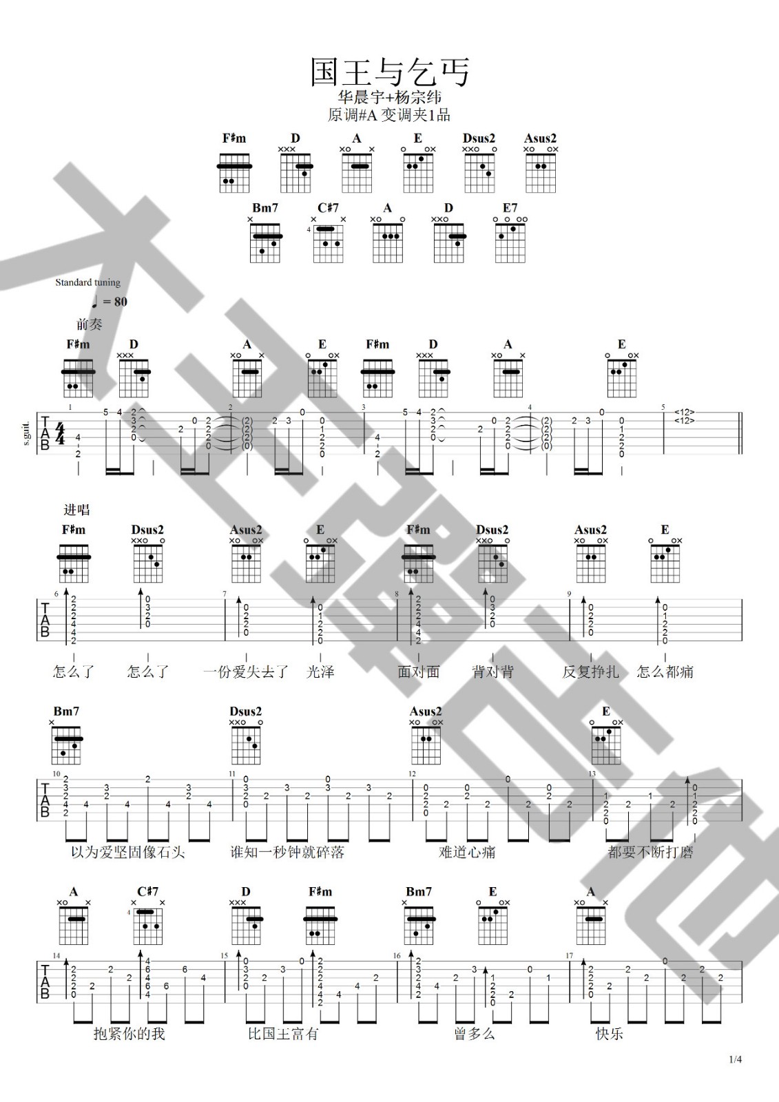 曲谱介绍: 华晨宇/杨宗纬《国王与乞丐》吉他弹唱谱,采用A调指法编配,大王弹吉他编配出品,共有5张高清图谱。