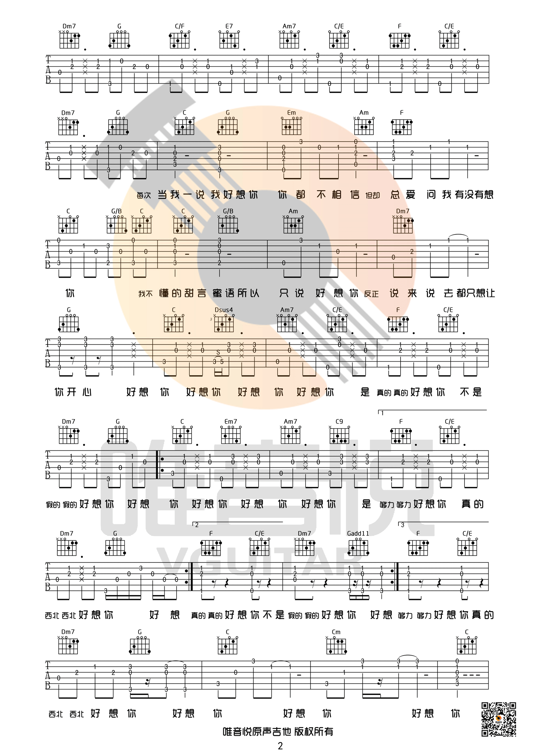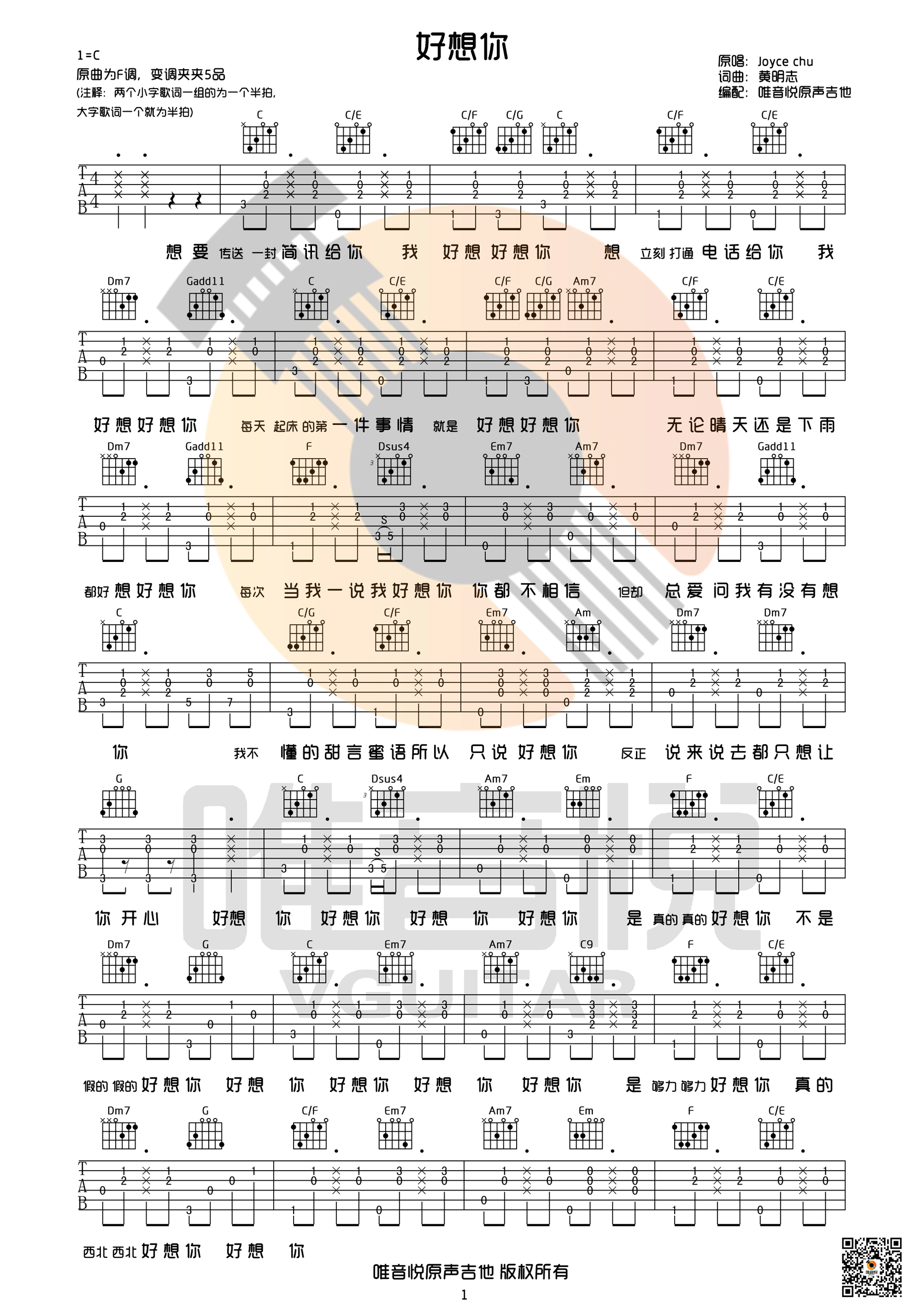 曲谱介绍: Joyce《好想你》吉他弹唱谱,采用C调指法编配,唯音悦编配出品,共有2张高清图谱,免翻页排版设计。