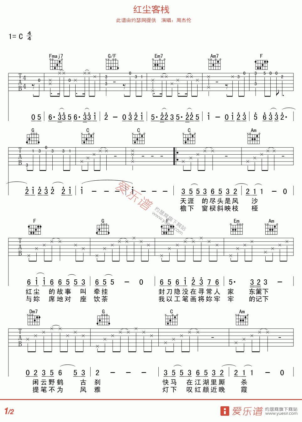 曲谱介绍: 附前奏《红尘客栈》吉他弹唱谱,采用C调指法编配,共有2张高清图谱,免翻页排版设计。