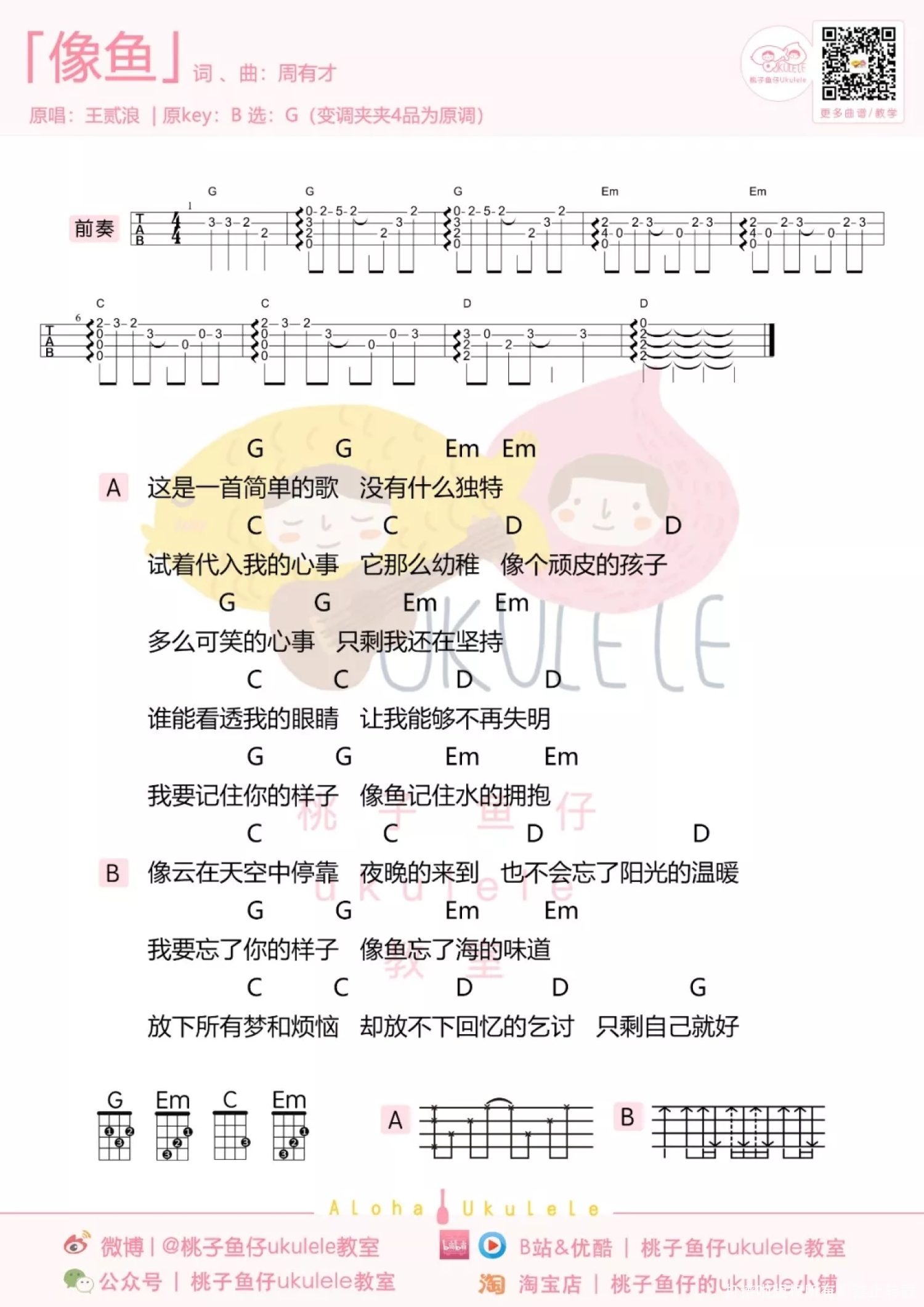 曲谱介绍: 王贰浪《像鱼》尤克里里谱,共有1张高清图谱,免翻页排版设计。