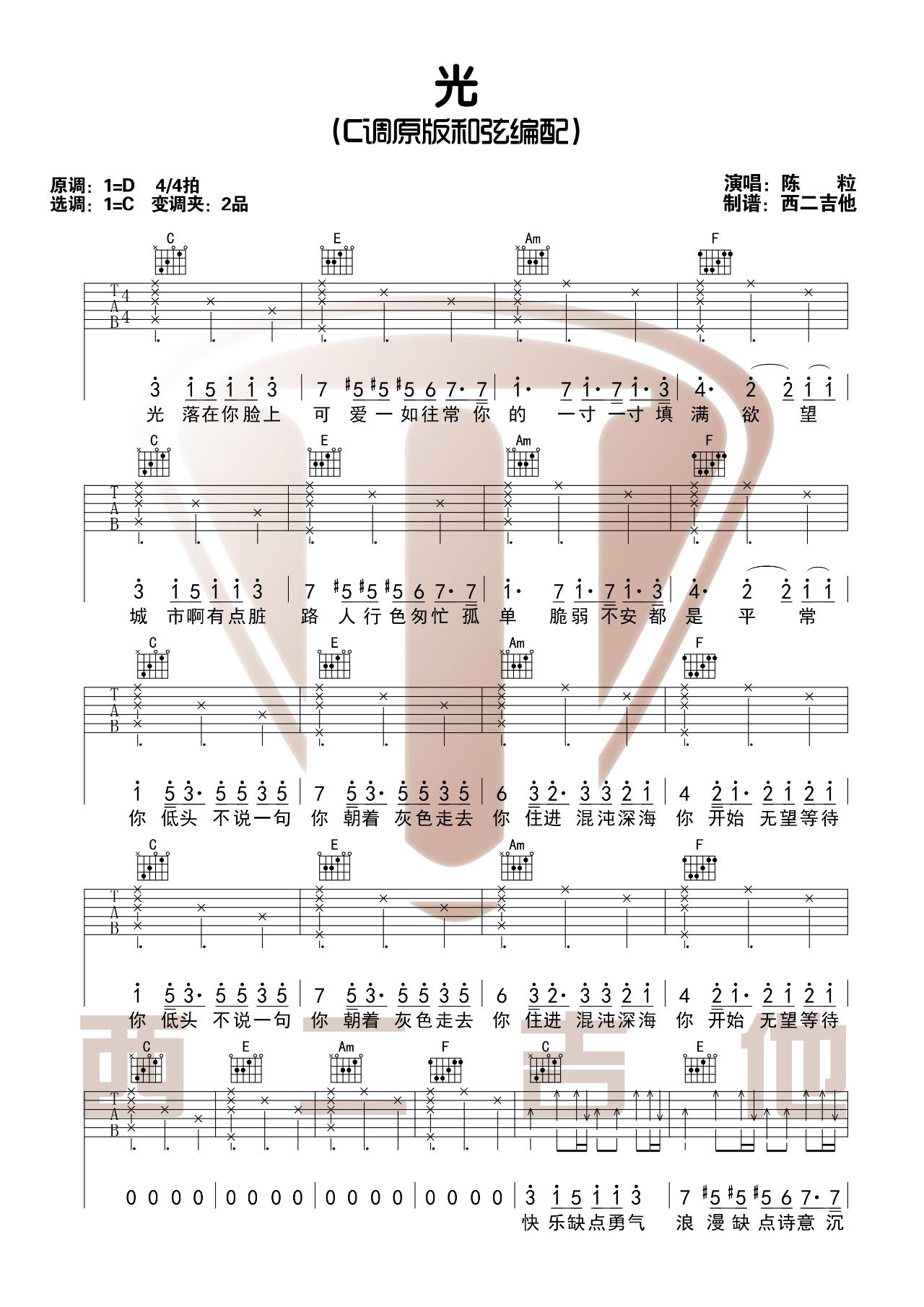 曲谱介绍: 陈粒《光》吉他弹唱谱,采用C调指法编配,西二吉他编配出品,共有2张高清图谱,免翻页排版设计。