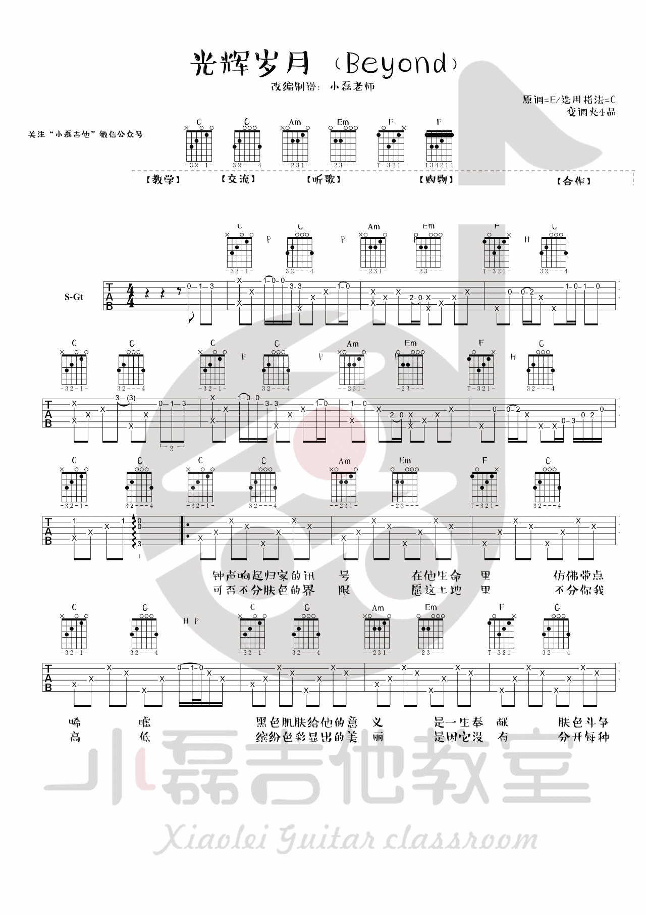 曲谱介绍: Beyond《光辉岁月》吉他弹唱谱,采用C调指法编配,小磊吉他教室编配出品,共有2张高清图谱,免翻页排版设计。
