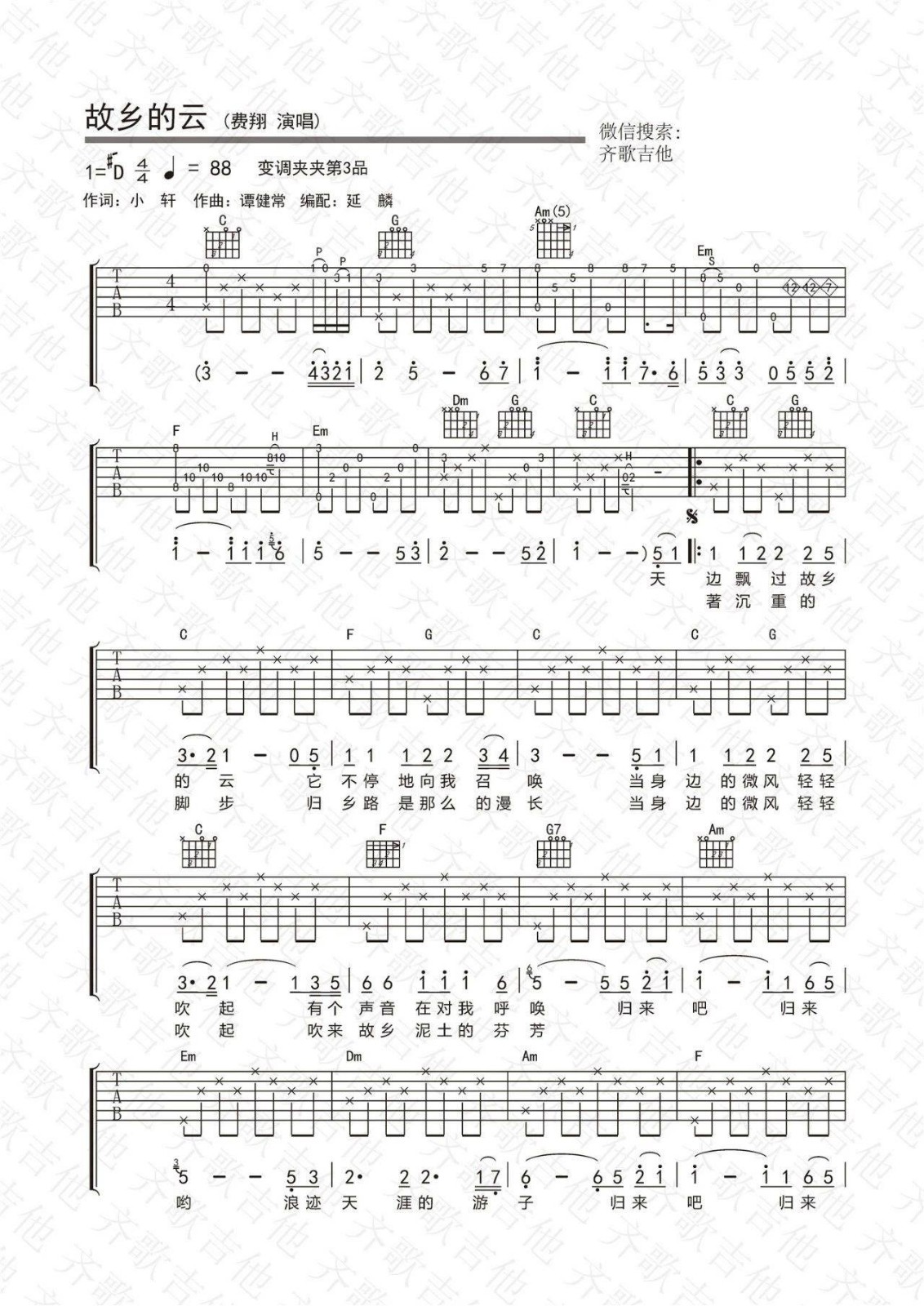 曲谱介绍: 费翔《故乡的云》吉他弹唱谱,采用C调指法编配,齐歌吉他编配出品,共有2张高清图谱,免翻页排版设计。