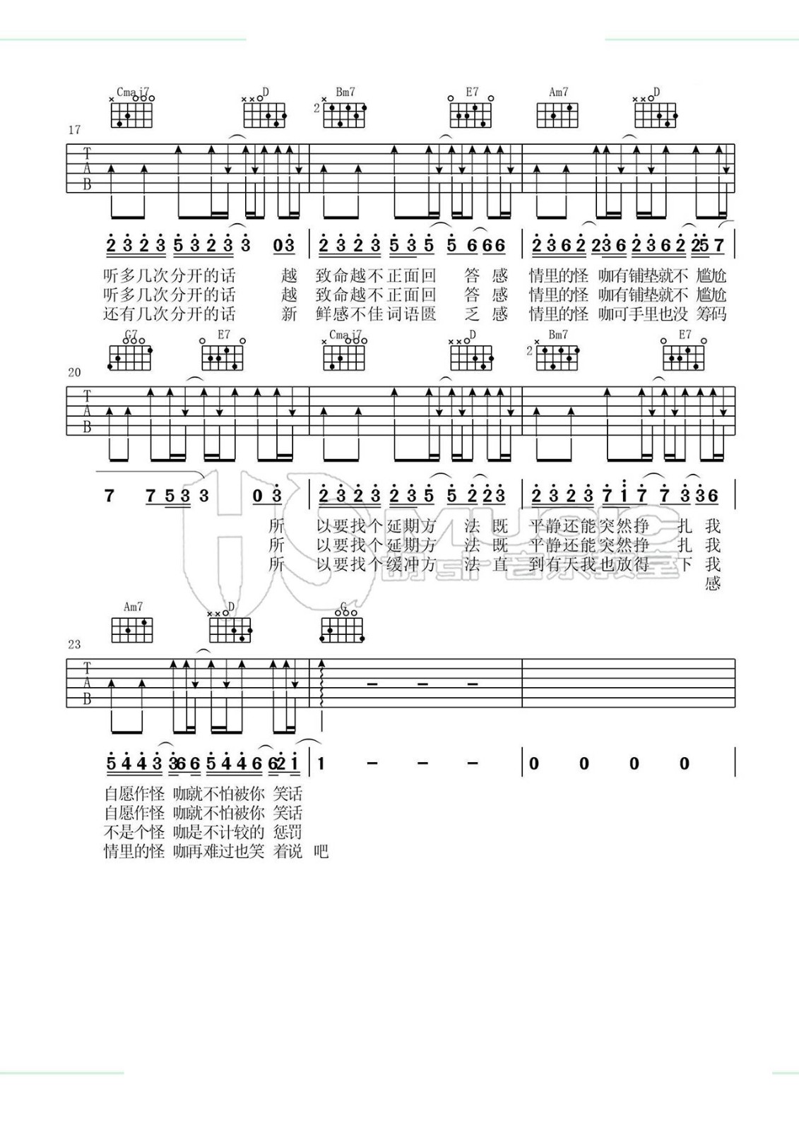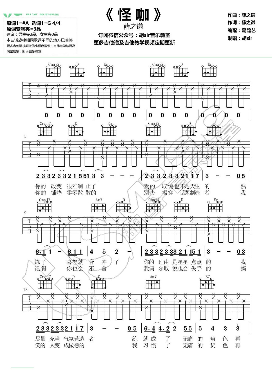曲谱介绍: 薛之谦《怪咖》吉他弹唱谱,采用G调指法编配,胡Sir吉他编配出品,共有2张高清图谱,免翻页排版设计。