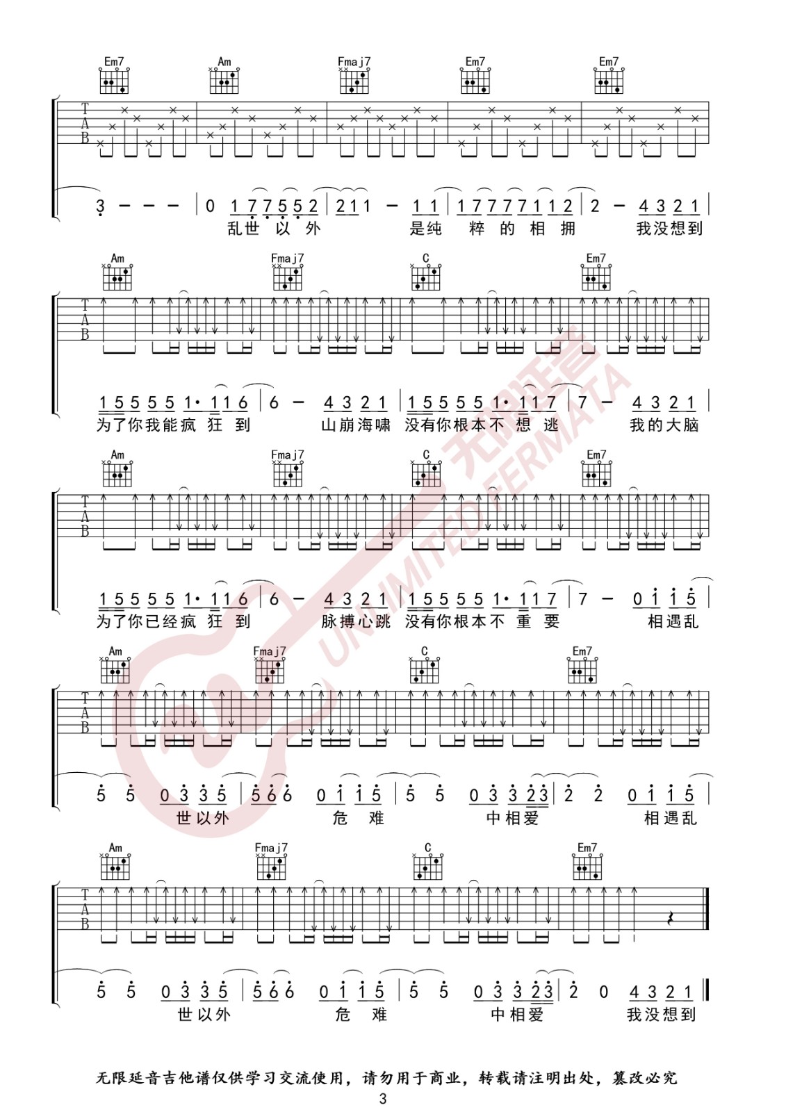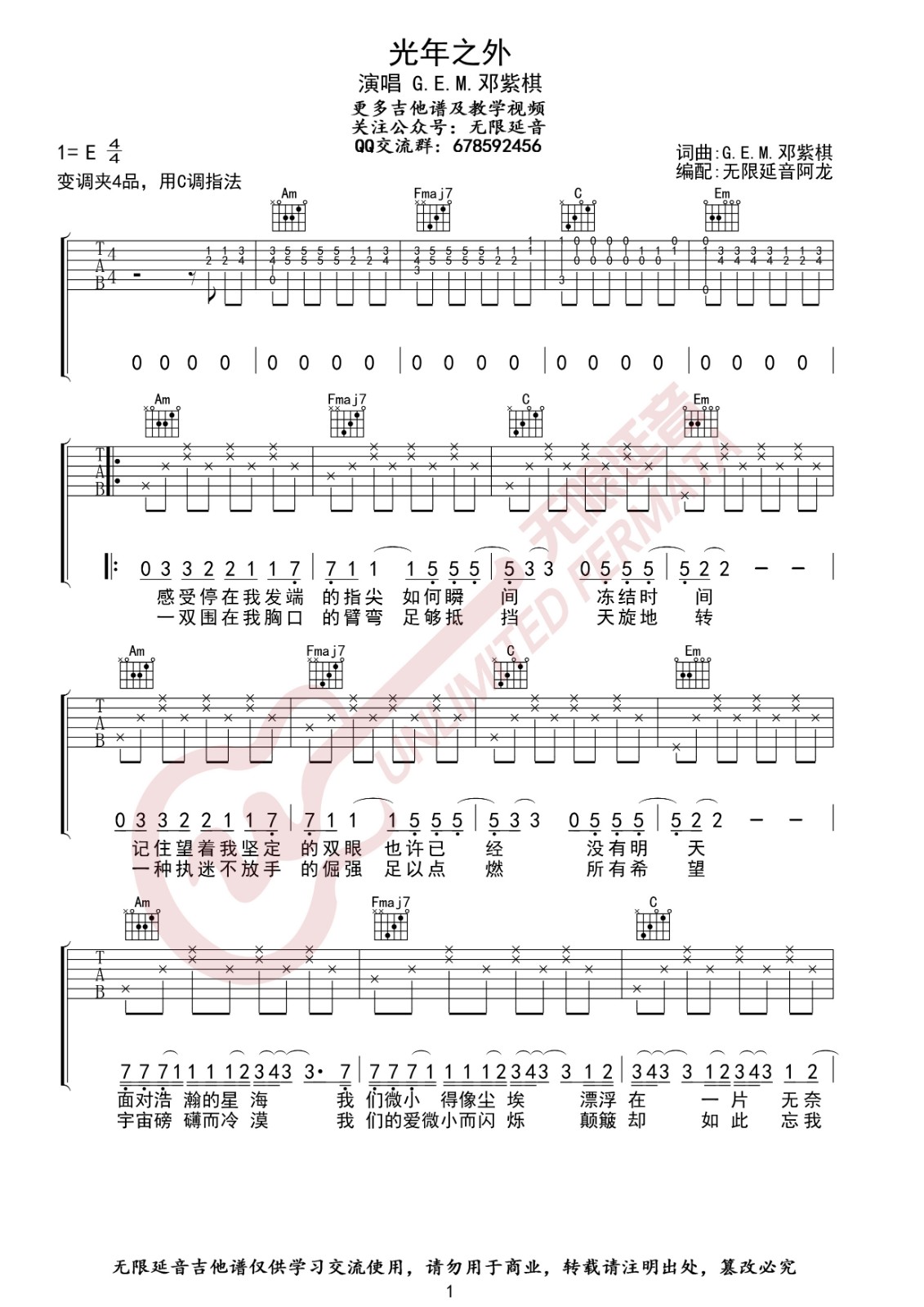 曲谱介绍: 邓紫棋《光年之外》吉他弹唱谱,采用C调指法编配,无限延音编配出品,共有3张高清图谱。