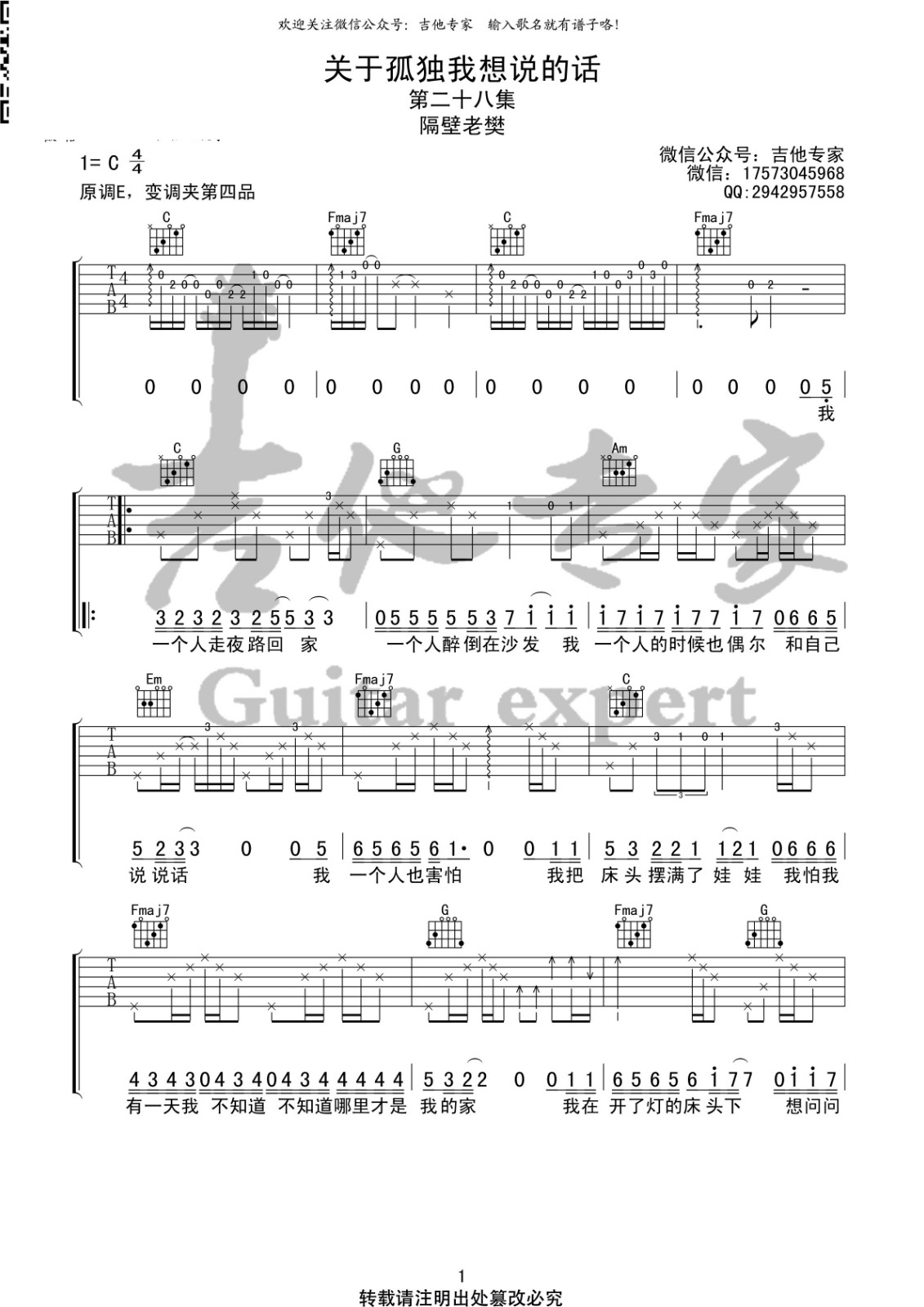 关于孤独我想说的话吉他谱 - 隔壁老樊 - C调吉他弹唱谱