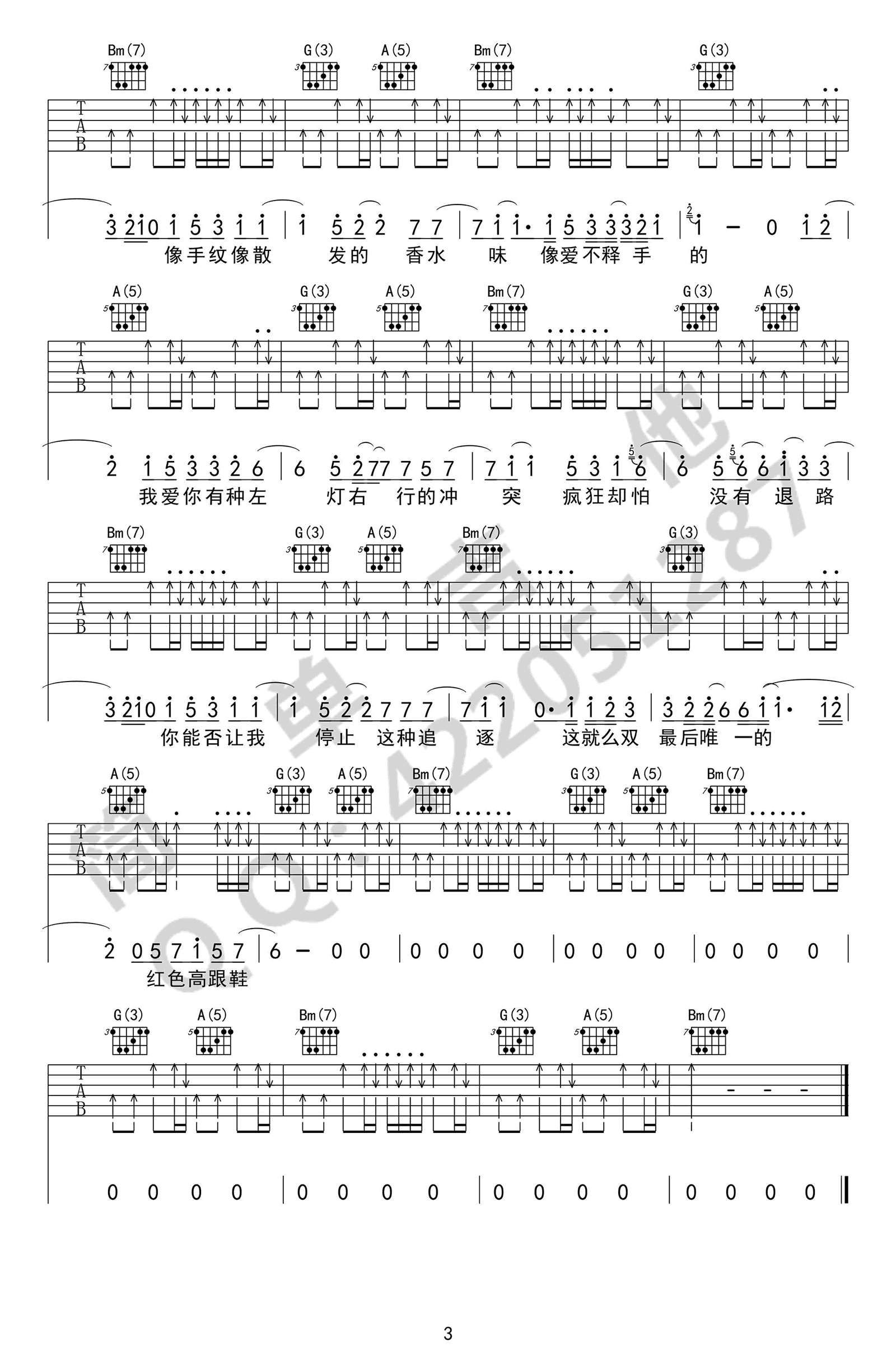 曲谱介绍: 蔡健雅《红色高跟鞋》吉他弹唱谱,采用D调指法编配,简单吉他编配出品,共有3张高清图谱。