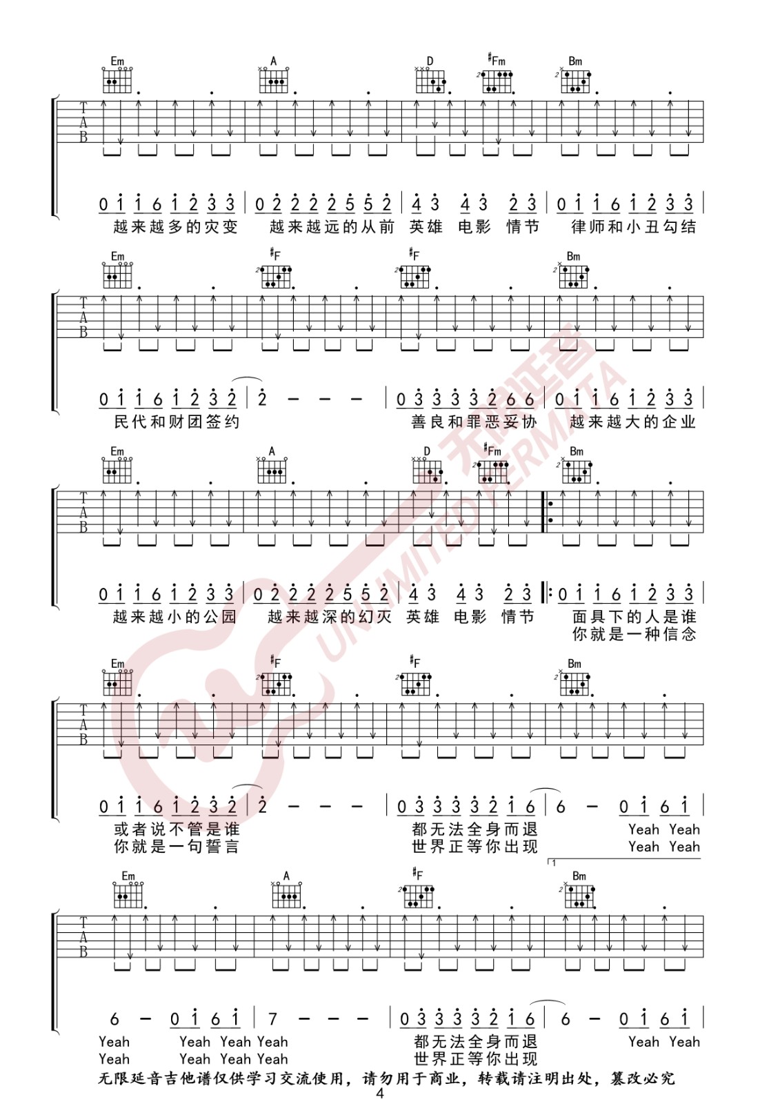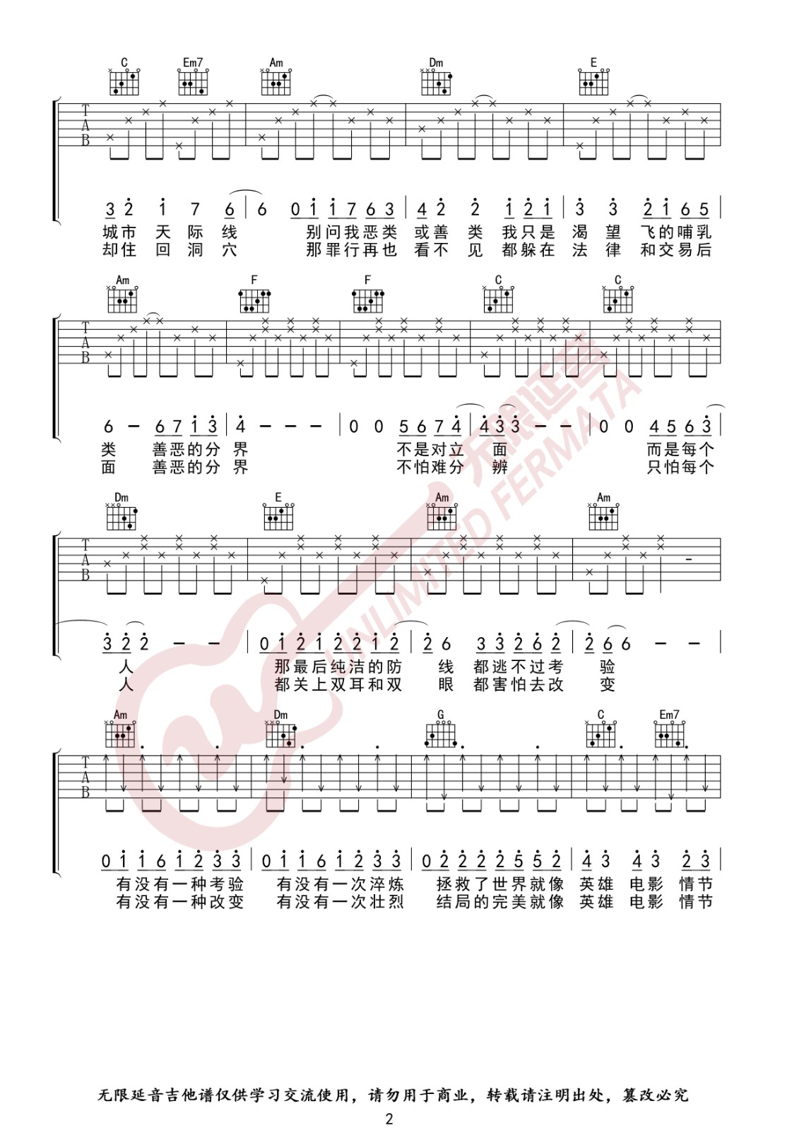 曲谱介绍: 林俊杰《黑暗骑士》吉他弹唱谱,采用C调指法编配,无限延音编配出品,共有5张高清图谱。