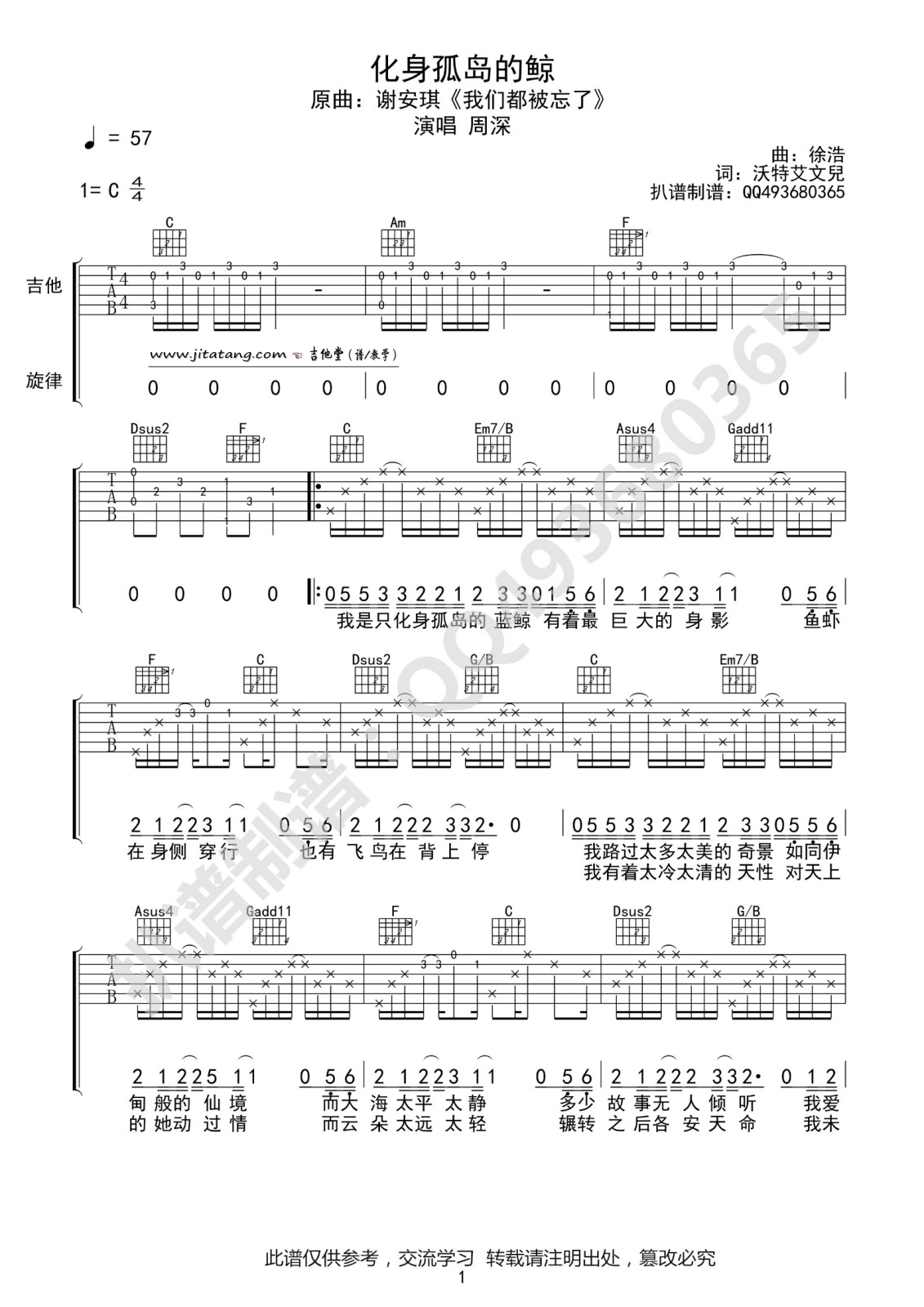 曲谱介绍: 周深《化身孤岛的鲸》吉他弹唱谱,采用C调指法编配,共有3张高清图谱。