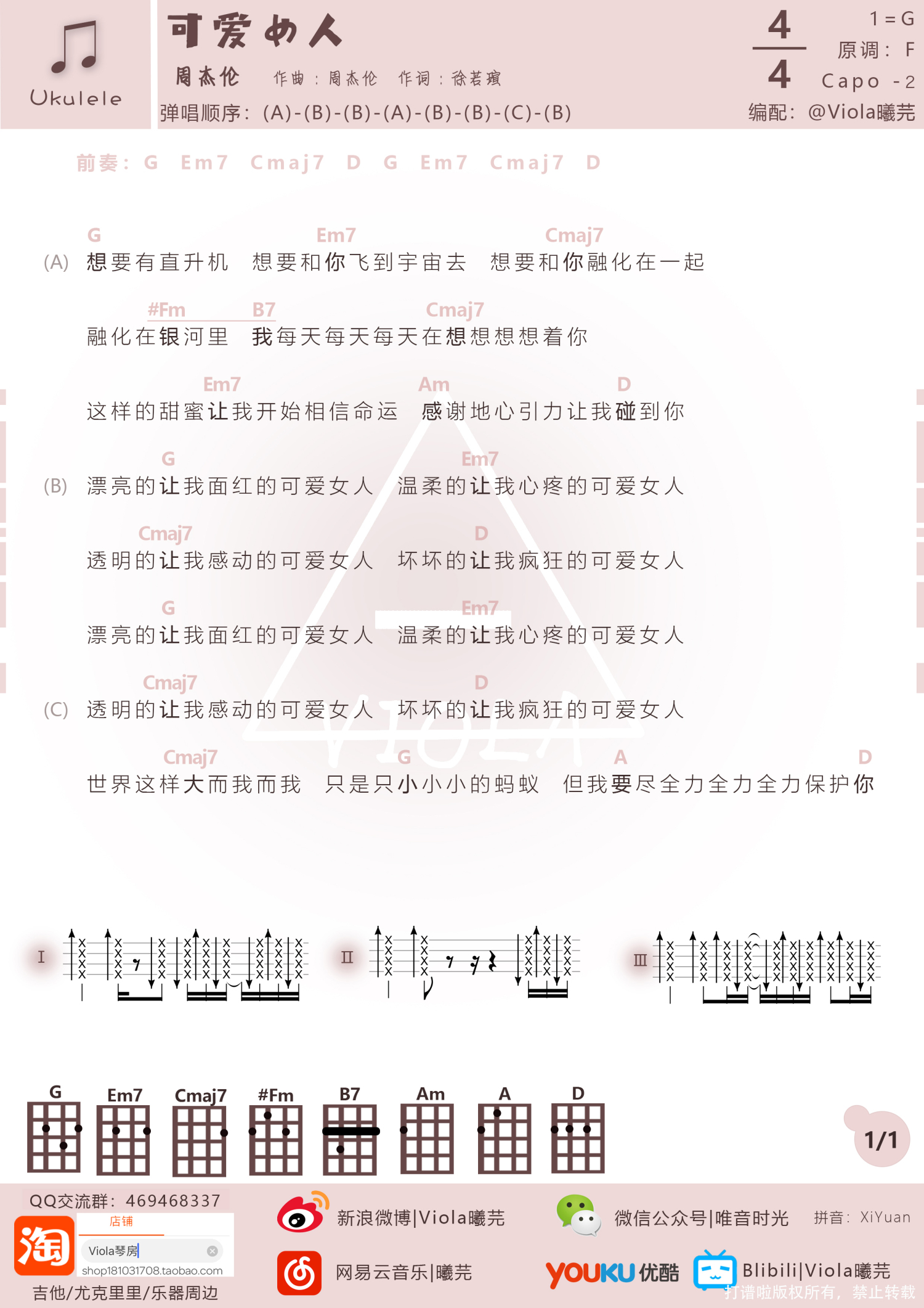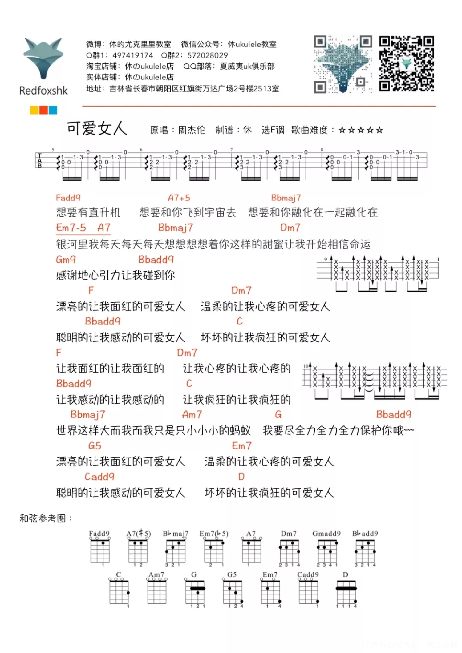 曲谱介绍: 这首歌真的是一首很不起眼的歌 很大一部分听过周杰伦的歌让他们提到周杰伦的老歌 都会忽略的的一首 这首歌属于简单好听系列 而且是非常洗脑又有意思的歌 桥段的转调可以是说很特别了 我的圣诞节不需要圣诞歌 因为我自认为圣诞节跟我没有任何关系 我不需要礼物 我也没见过圣诞老人 只需要一首周董暖心小歌就可以迷倒小姐姐的芳心 还和辣些男人都不一样 一举多得 何乐而不为呢   可爱女人ukulele弹唱   可爱女人ukulele教学   可爱女人尤克里里谱 G调   可爱女人ukulele谱 原F调