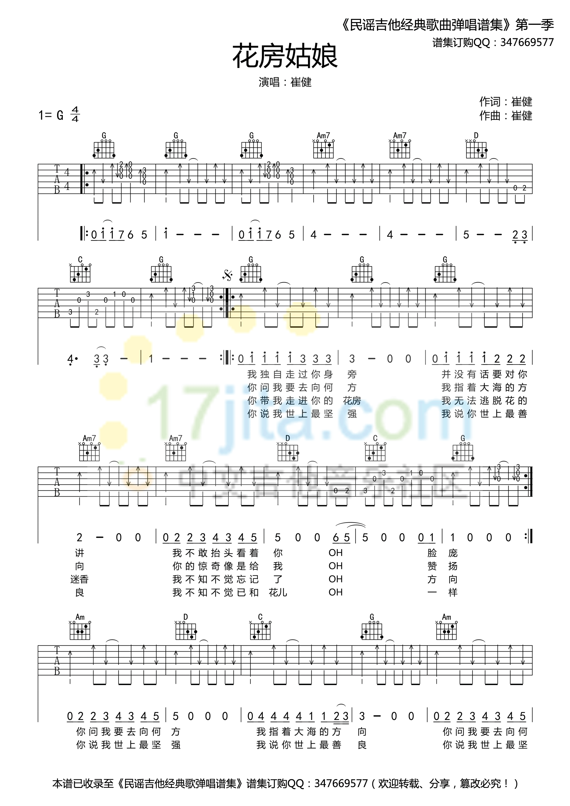 曲谱介绍: 崔健《花房姑娘》吉他弹唱谱,采用G调指法编配,17吉他编配出品,共有1张高清图谱,免翻页排版设计。