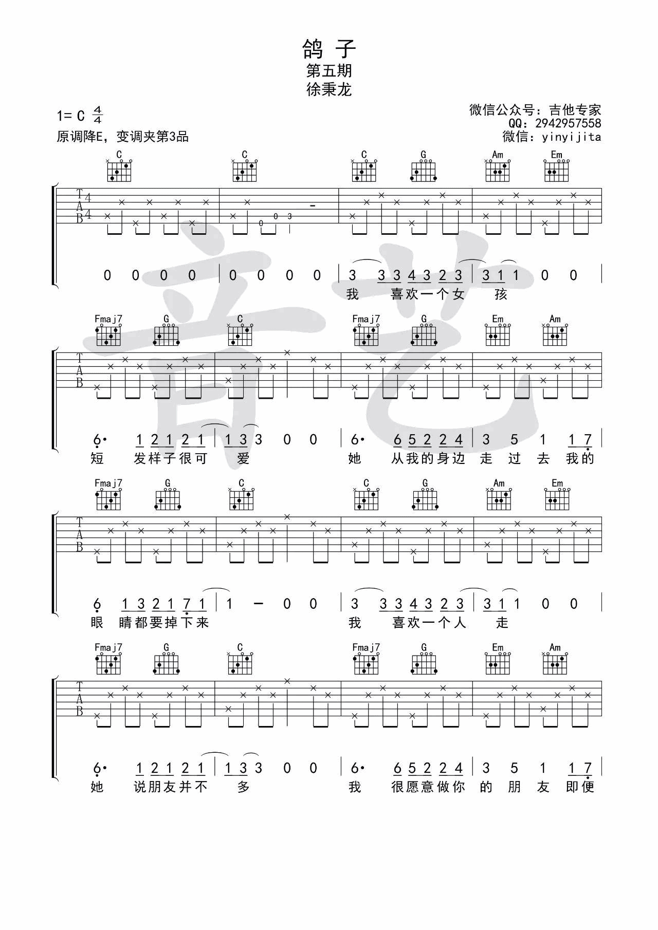 曲谱介绍: 徐秉龙《鸽子》吉他弹唱谱,采用C调指法编配,音艺吉他编配出品,共有3张高清图谱。