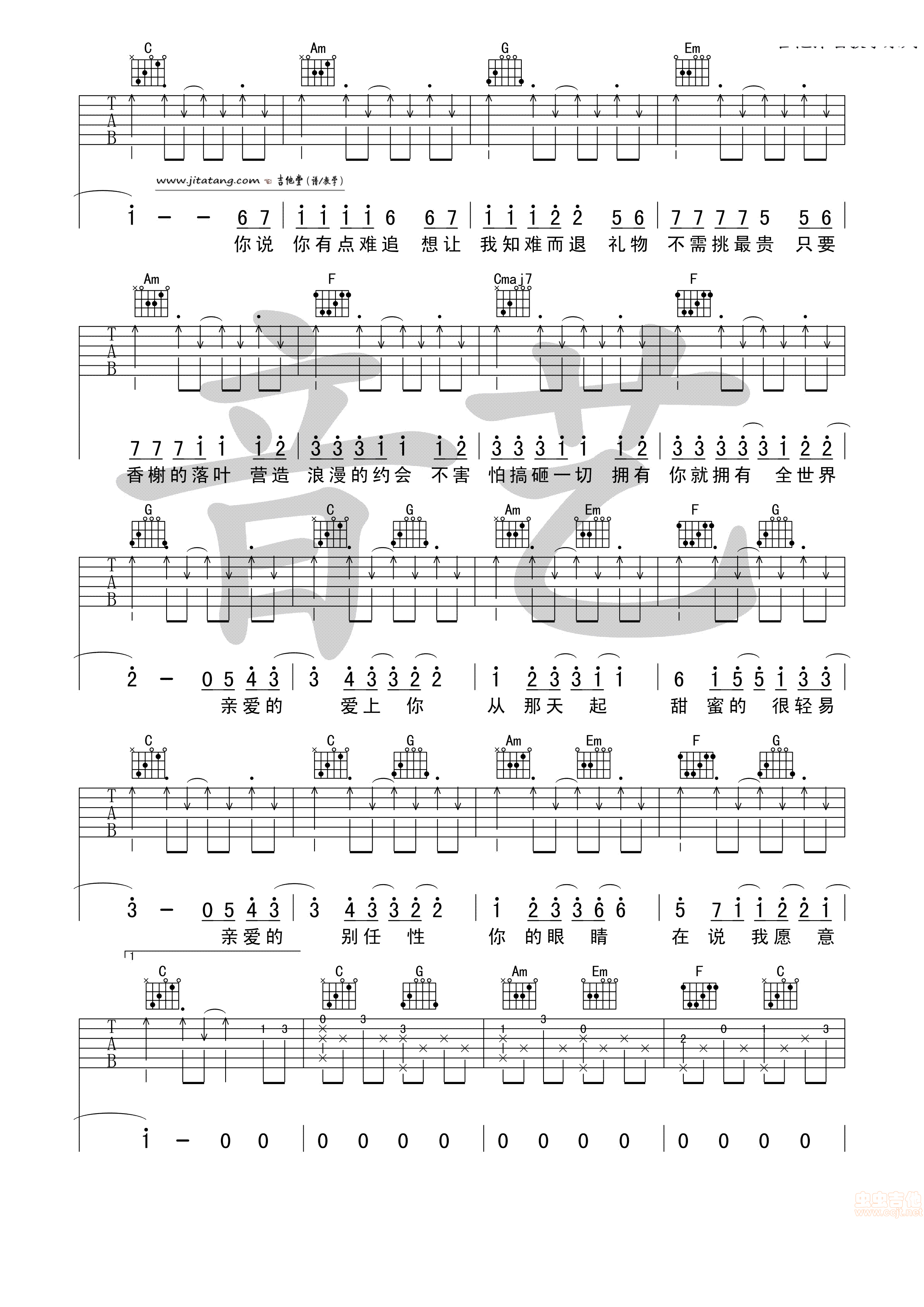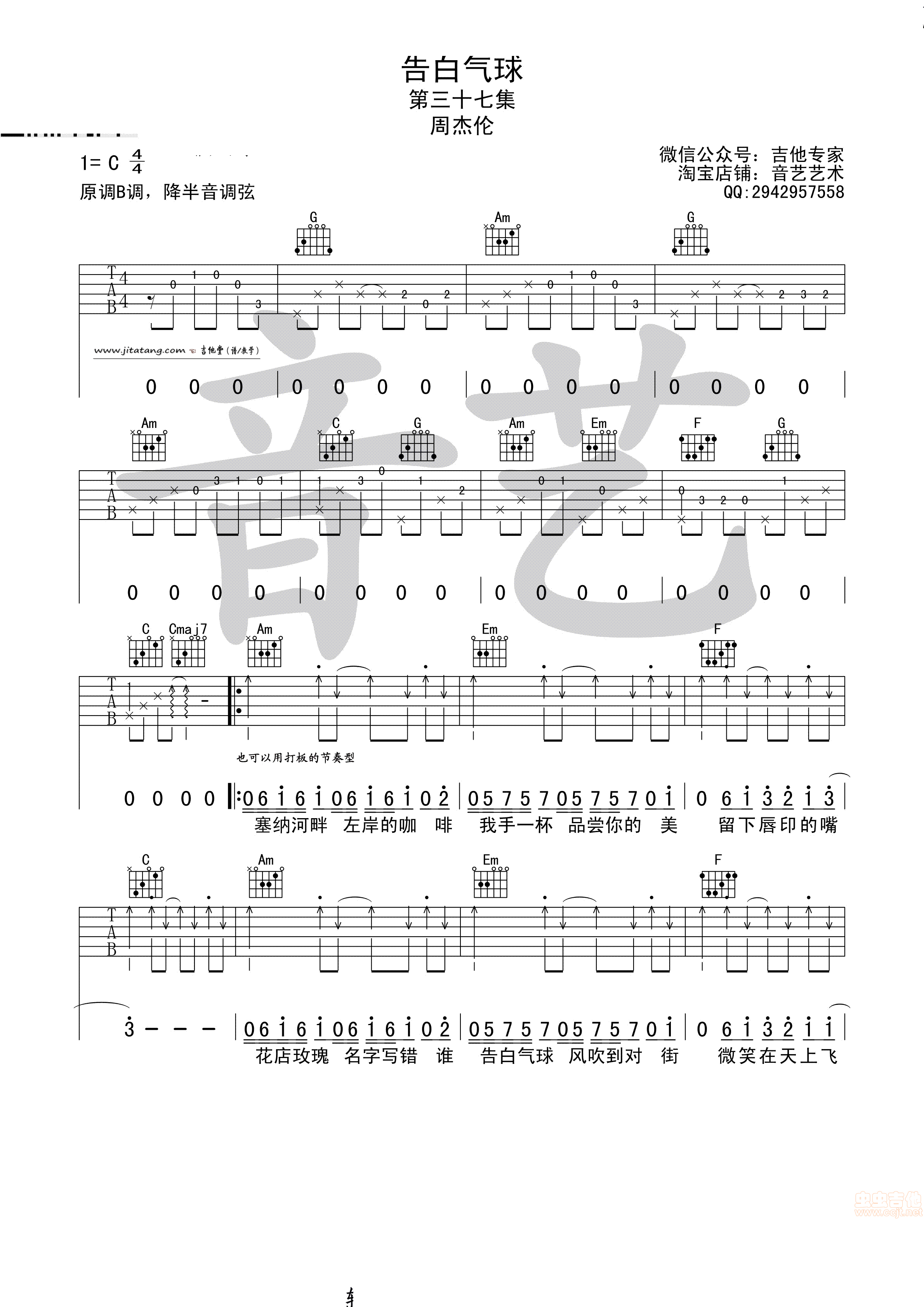 曲谱介绍: 周杰伦《告白气球》吉他弹唱谱,采用C调指法编配原版,音艺吉他编配出品,共有3张高清图谱。