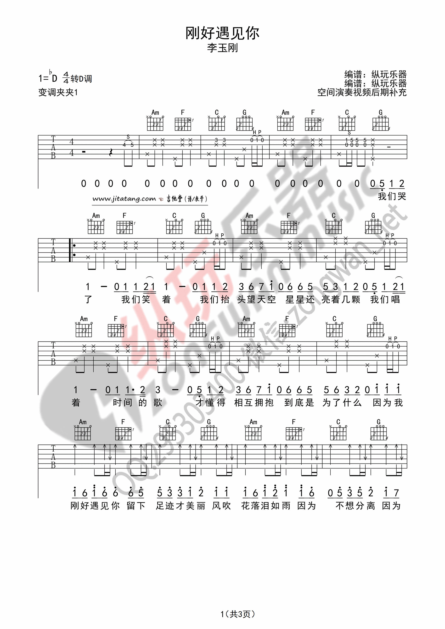 曲谱介绍: 李玉刚《刚好遇见你》吉他弹唱谱,采用D调指法编配,纵玩乐器编配出品,共有2张高清图谱,免翻页排版设计。