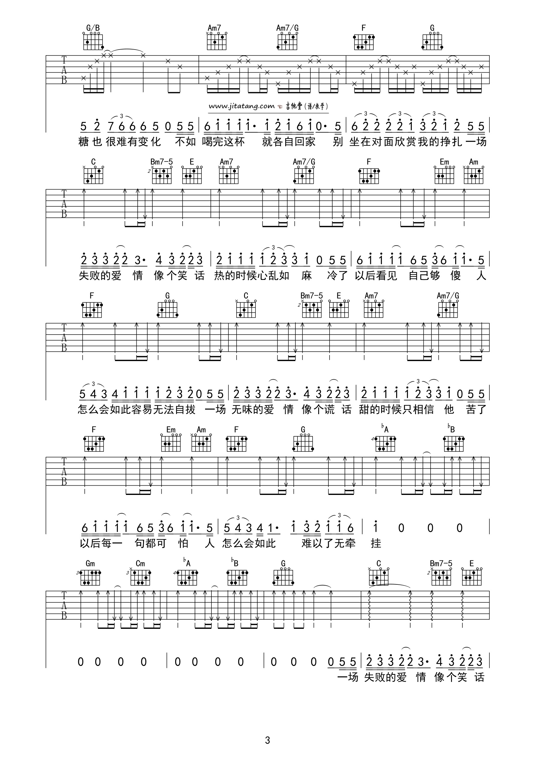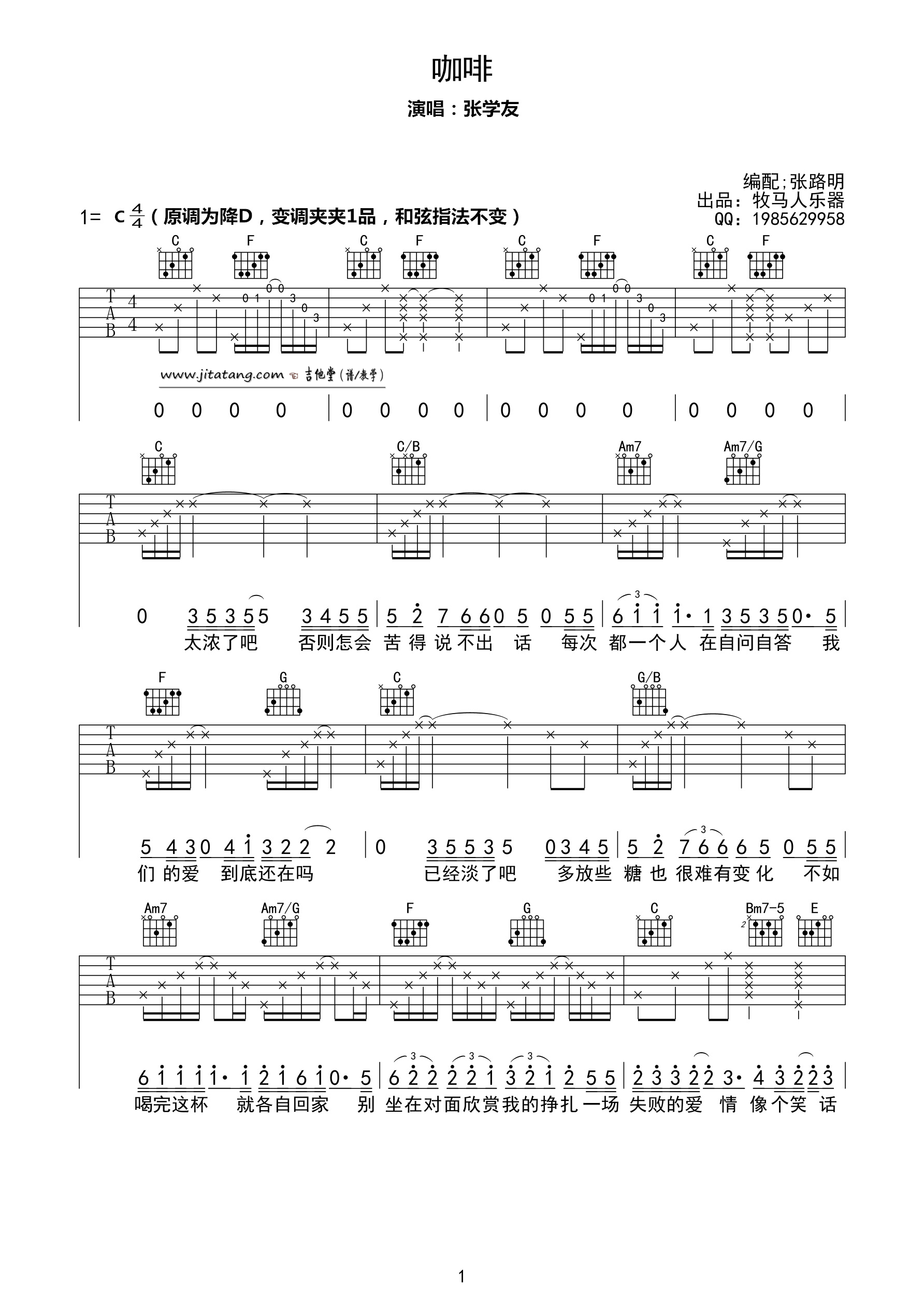 曲谱介绍: 张学友《咖啡》吉他弹唱谱,采用C调指法编配,牧马人乐器编配出品,共有4张高清图谱。