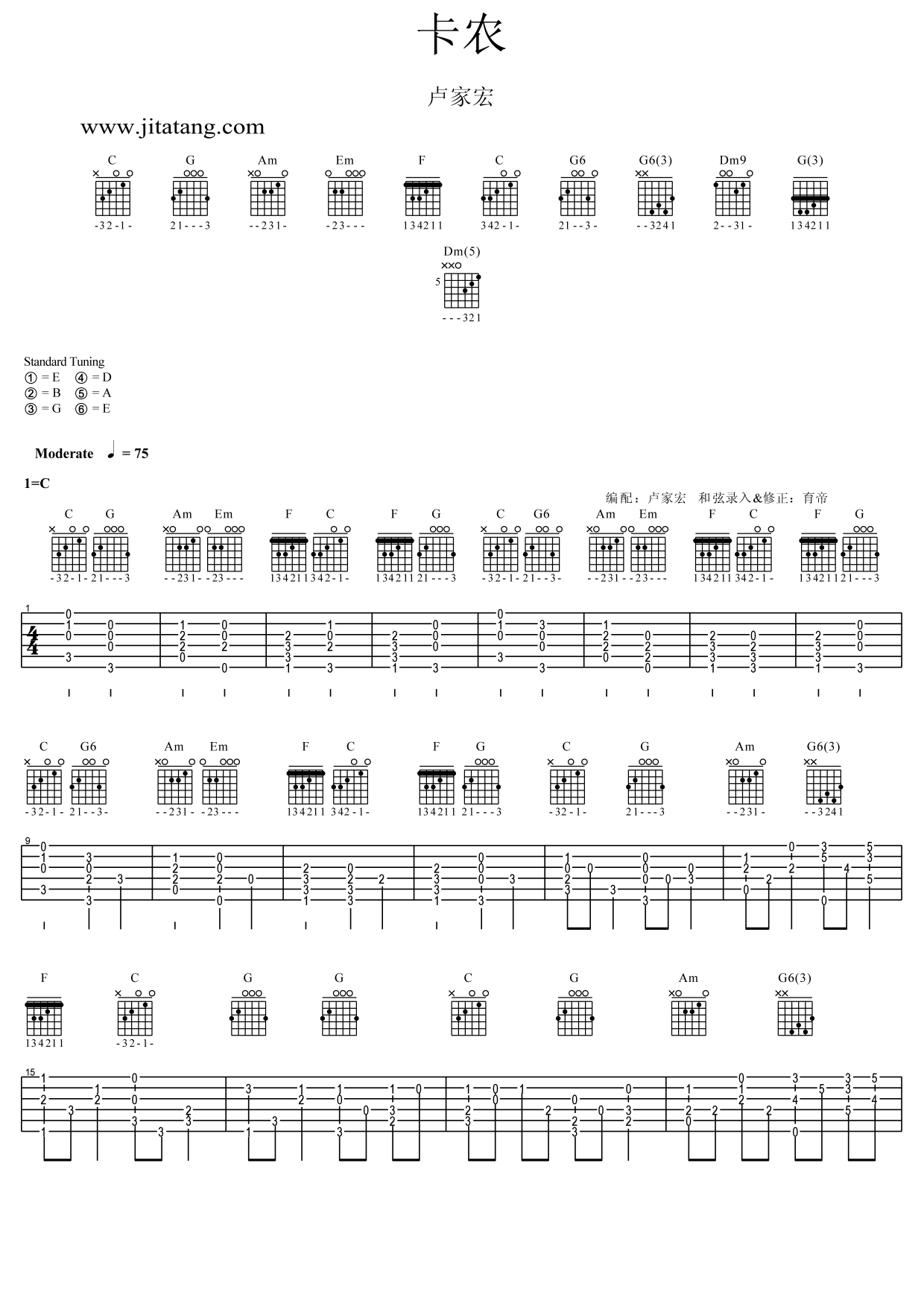 曲谱介绍: 卢家宏《卡农》吉他弹唱谱,采用C调指法编配,卢家宏编配出品,共有6张高清图谱。