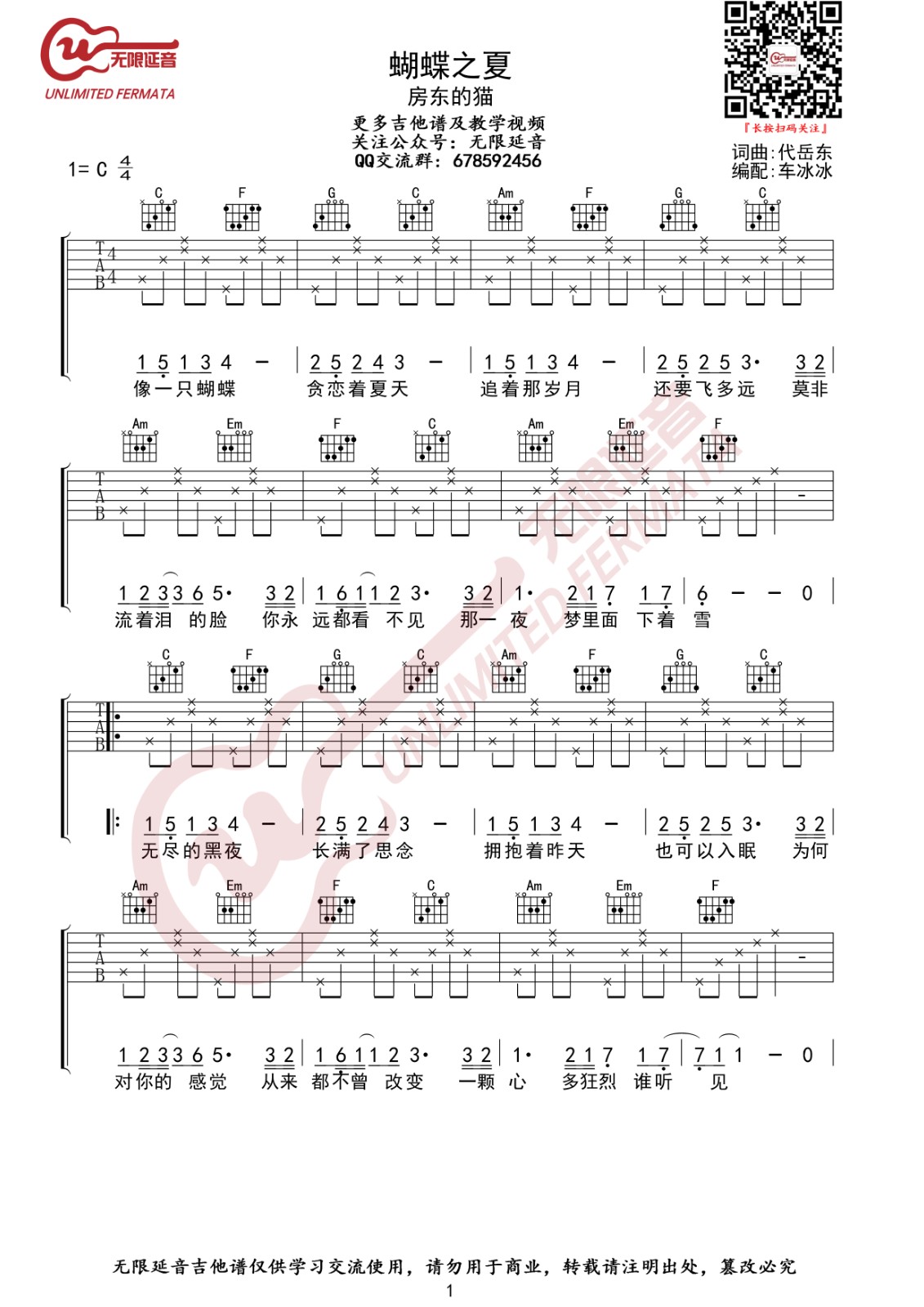 曲谱介绍: 房东的猫《蝴蝶之夏》吉他弹唱谱,采用C调指法编配,无限延音编配出品,共有3张高清图谱。