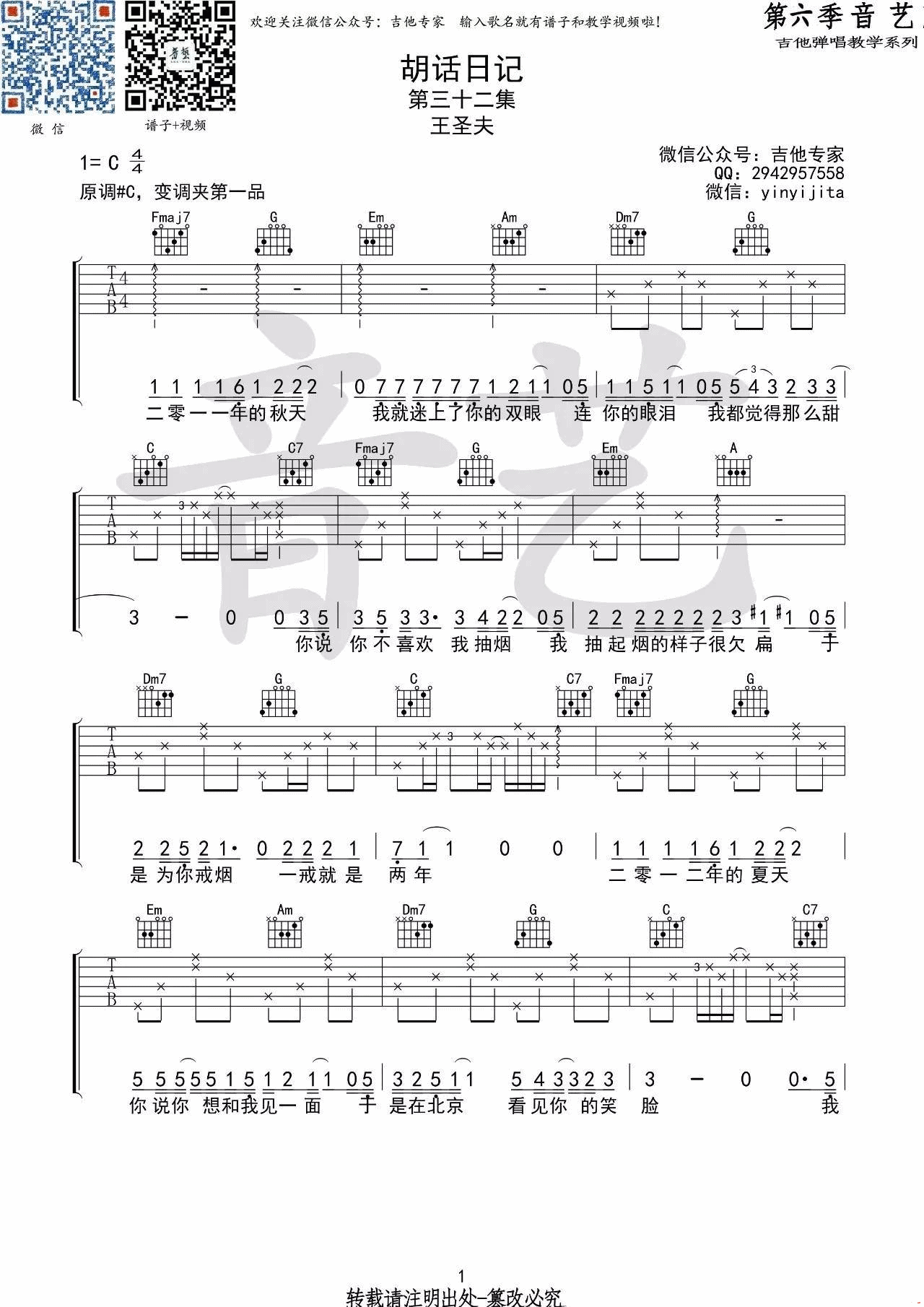 曲谱介绍: 王圣夫《胡话日记》吉他弹唱谱,采用C调指法编配,音艺吉他编配出品,共有4张高清图谱。