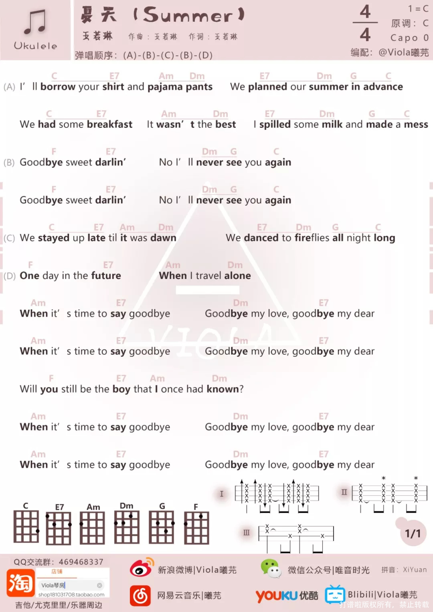 曲谱介绍: 王若琳悄咪咪的出了一张新专辑 《摩登悲剧》 其中夏天这首歌我一听便觉得特别有味道 而且越听越好听 相信每个人都有一段青春时光 懵懂的、甜甜的、羞涩的 却来不及抓住就仓促消逝的 这首歌唱的就是Joanna的这段时光 也是我们的   弹唱 网易云搜索电台“曦芫”,可以听这首翻唱的音频喔~   尤克里里弹唱曲谱
