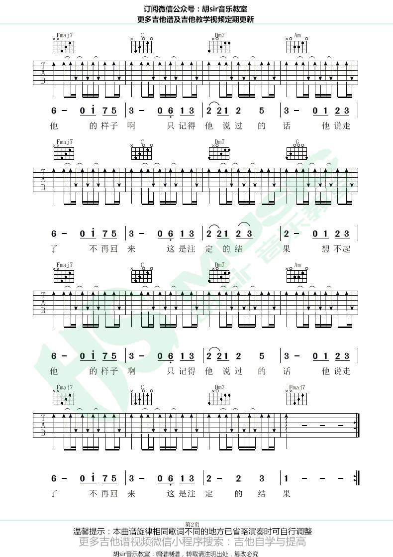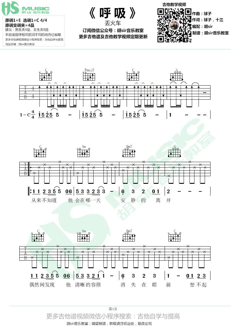 曲谱介绍: 丢火车乐队《呼吸》吉他弹唱谱,采用C调指法编配,胡sir吉他教室编配出品,共有2张高清图谱,免翻页排版设计。