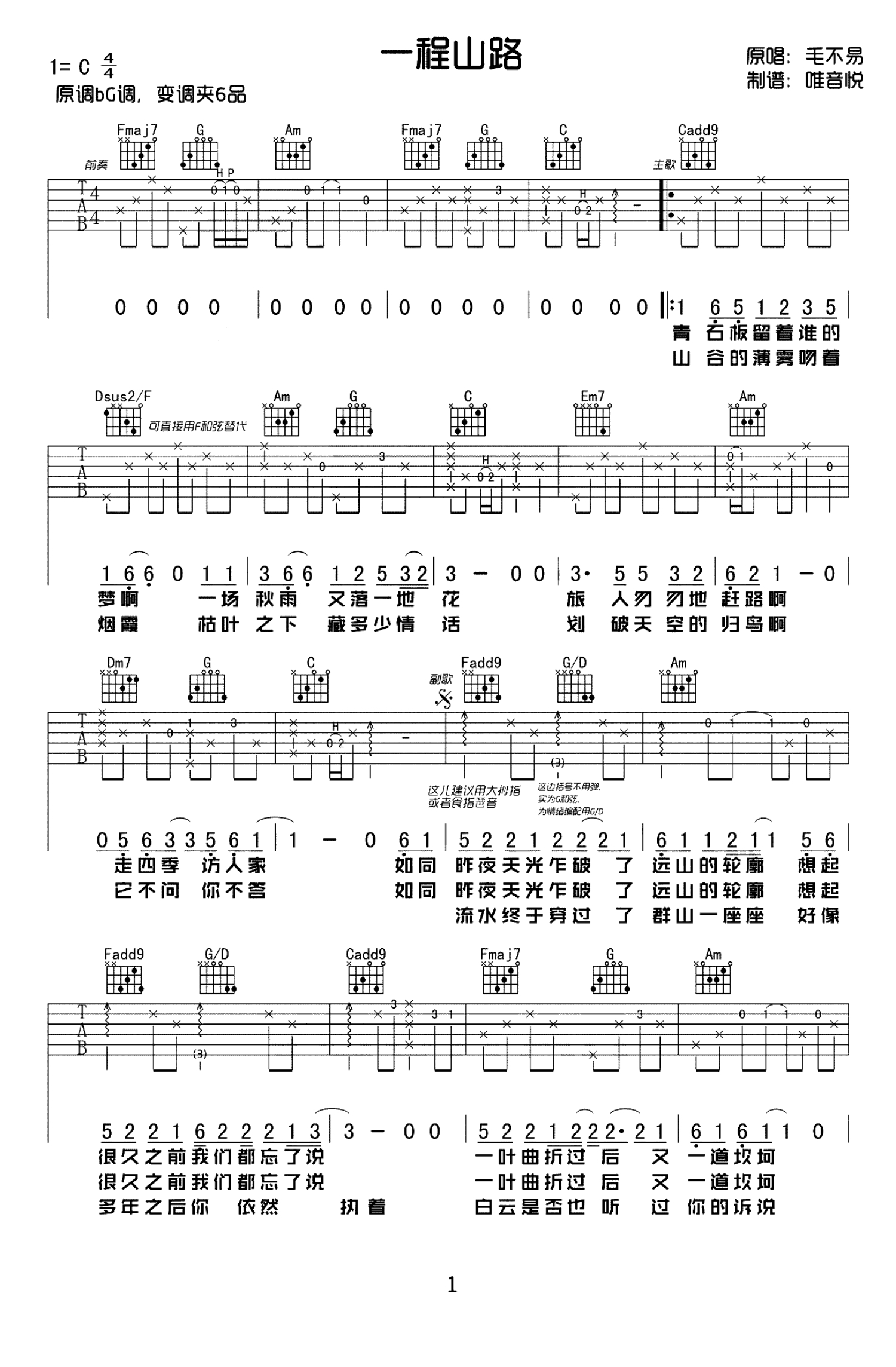 一程山路吉他谱 - 毛不易 - C调吉他弹唱谱