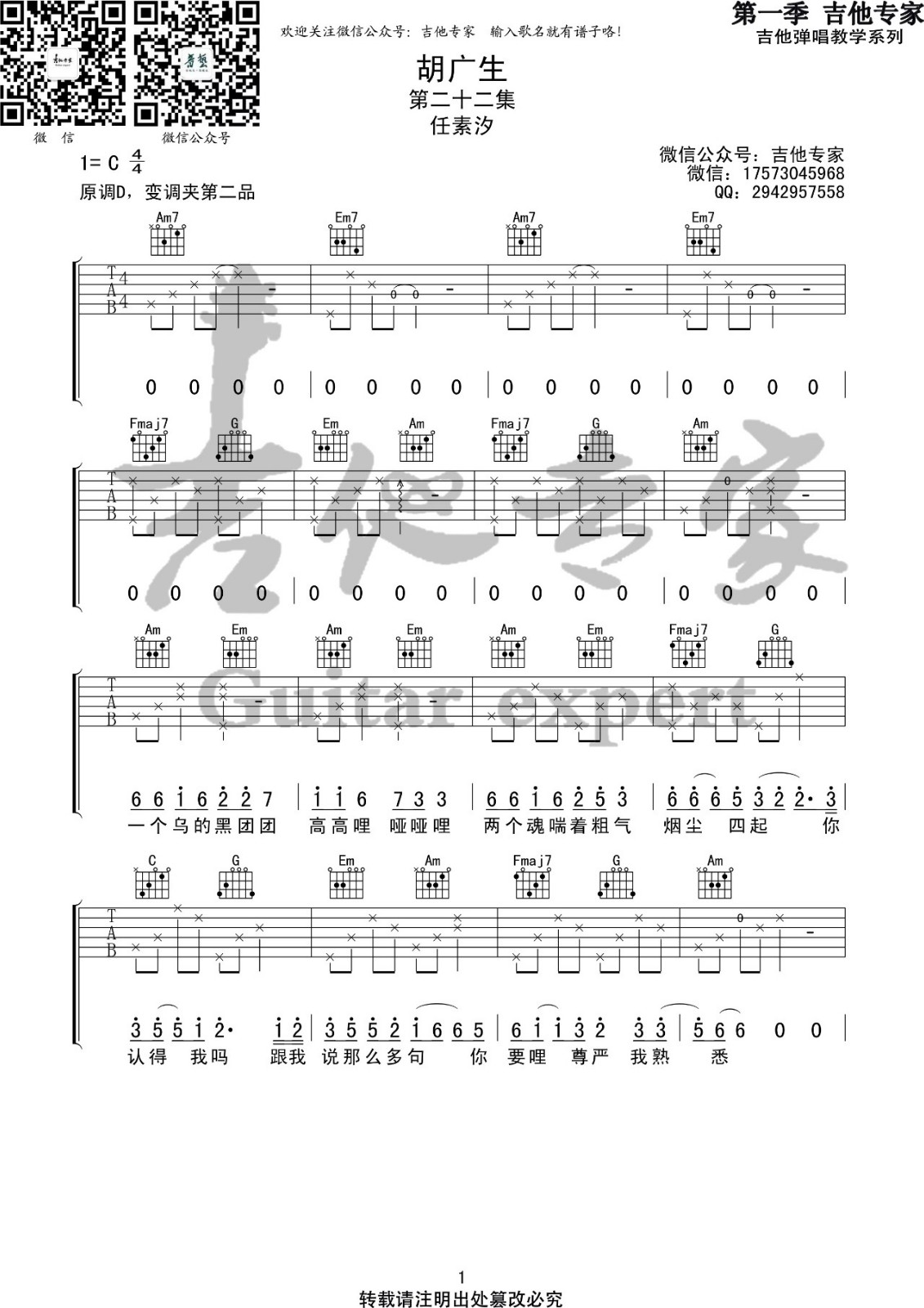 曲谱介绍: 任素汐《胡广生》吉他弹唱谱,采用C调指法编配,音艺吉他编配出品,共有3张高清图谱。