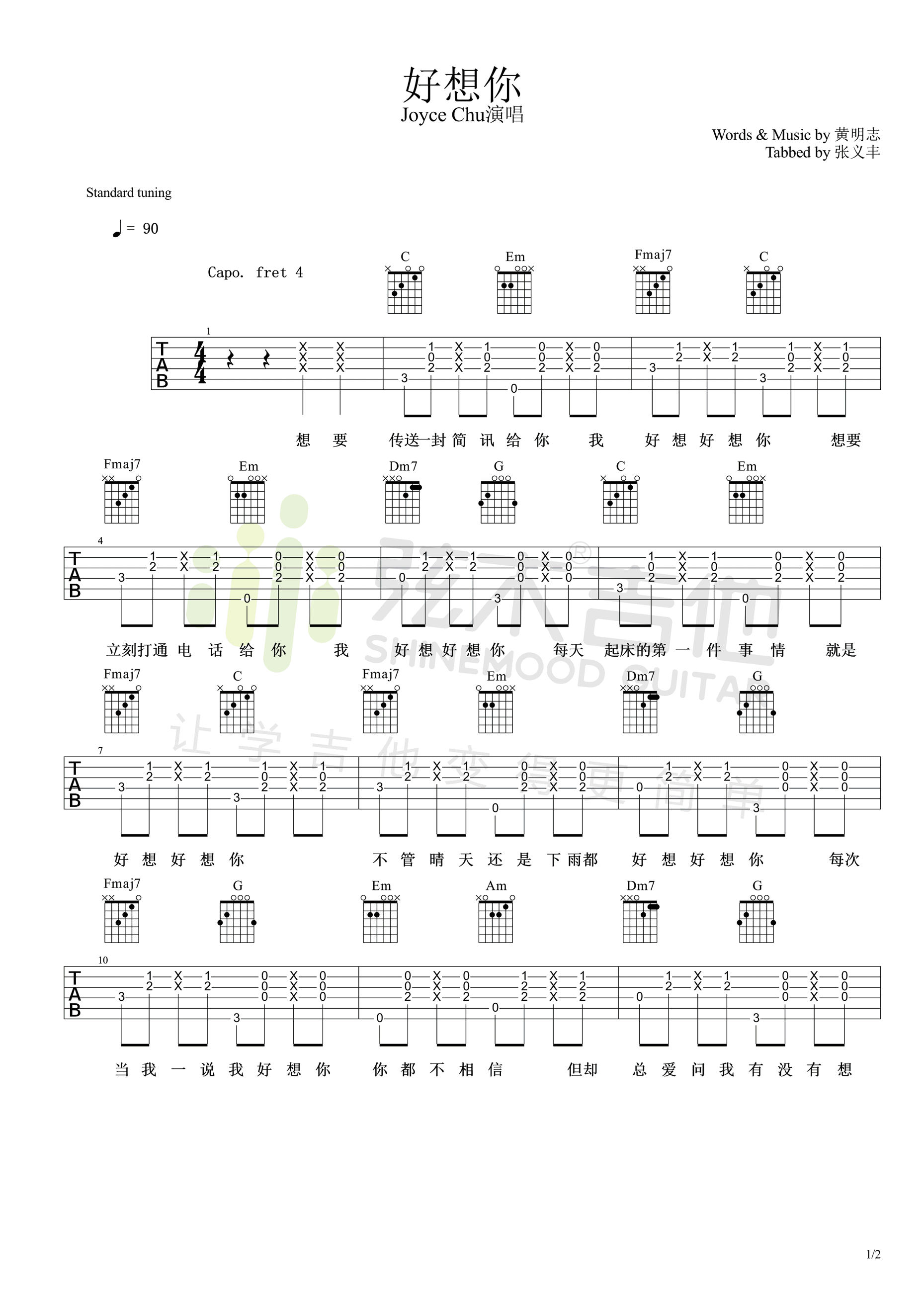 好想你吉他谱 - 朱主爱 - C调吉他弹唱谱