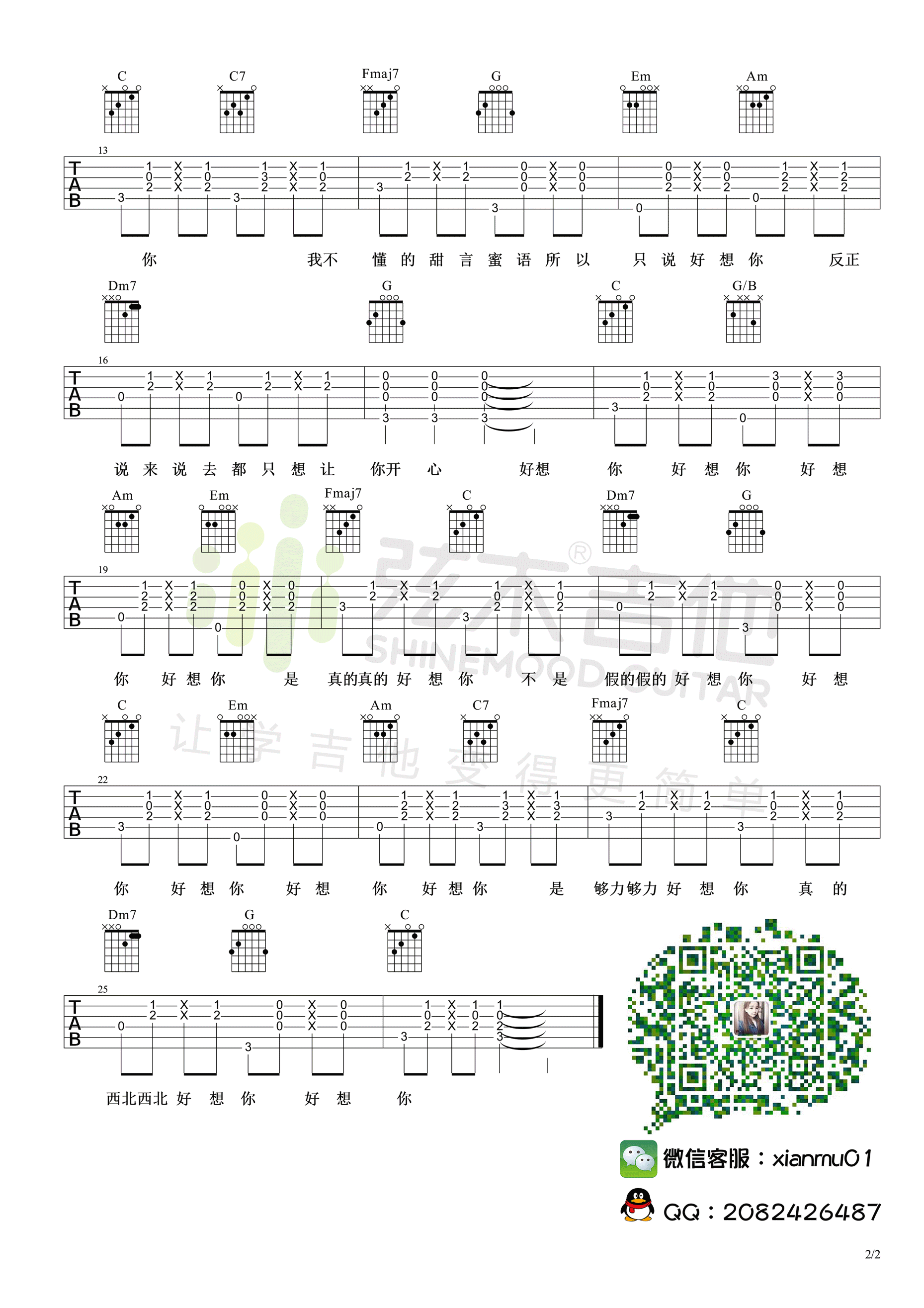 曲谱介绍: 朱主爱《好想你》吉他弹唱谱,采用C调指法编配,弦木吉他编配出品,共有2张高清图谱,免翻页排版设计。