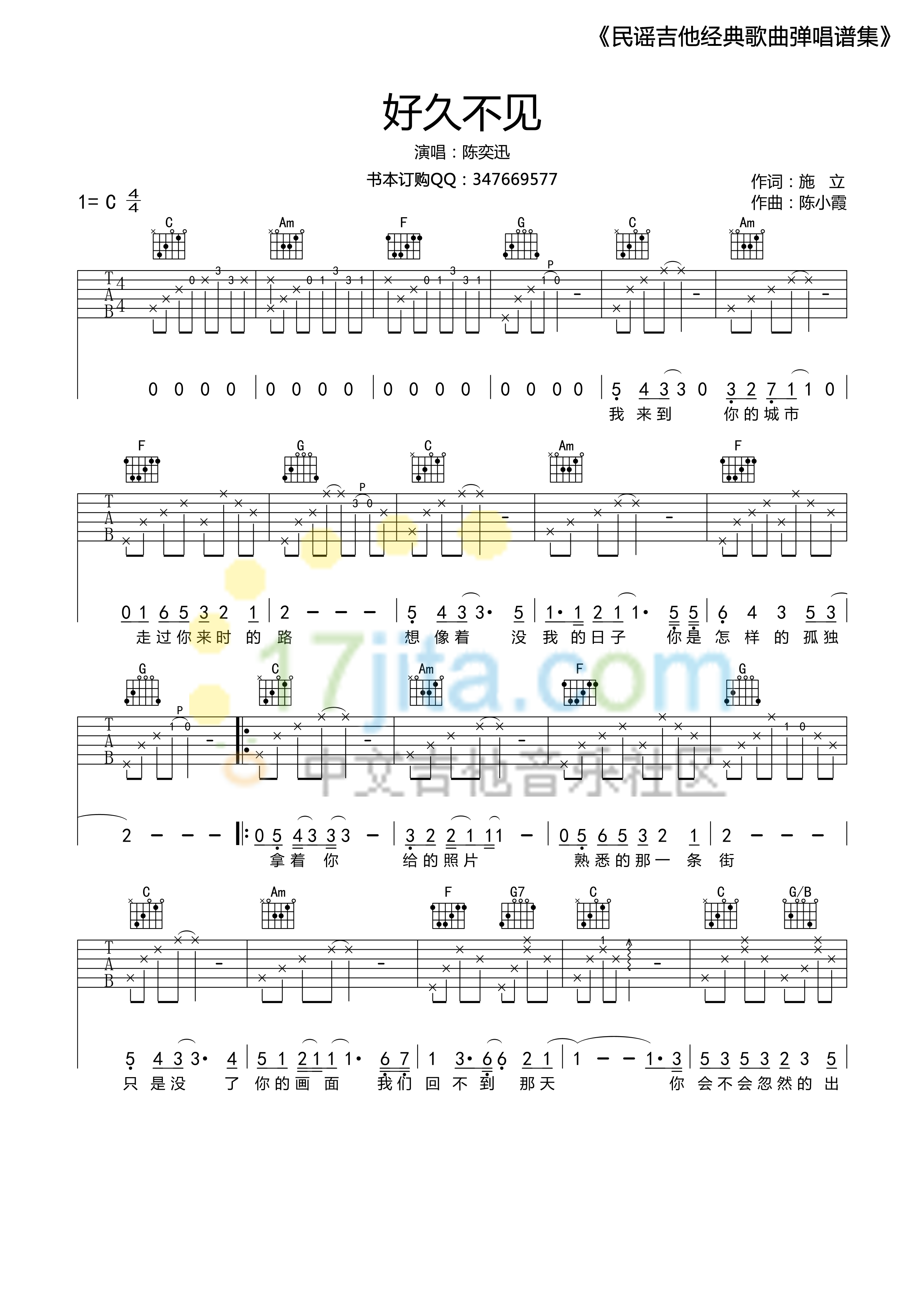 曲谱介绍: 陈奕迅《好久不见》吉他弹唱谱,采用C调指法编配,17吉他编配出品,共有2张高清图谱,免翻页排版设计。