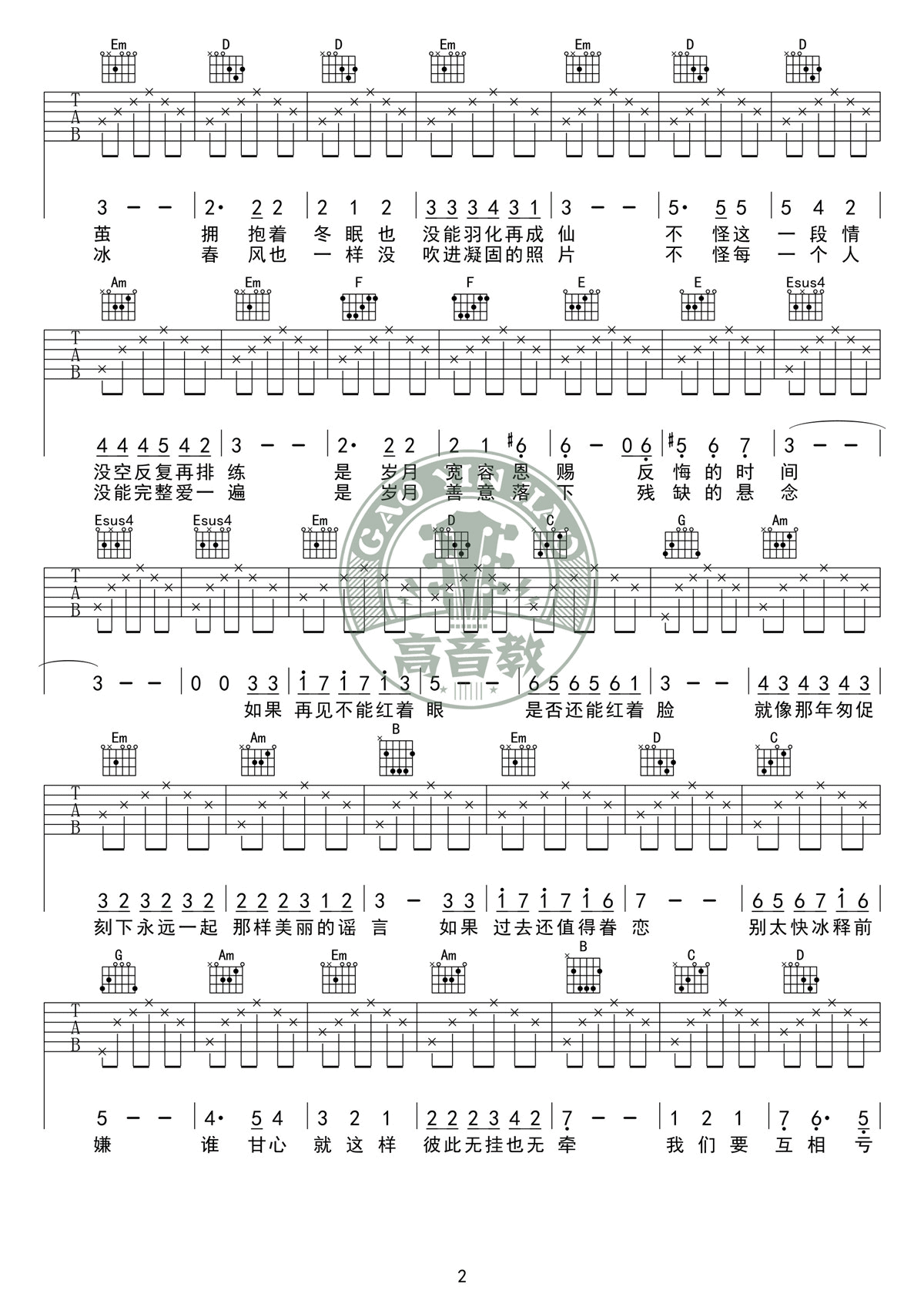 曲谱介绍: 王菲《匆匆那年》吉他弹唱谱,采用G调指法编配,高音教乐器编配出品,共有3张高清图谱。