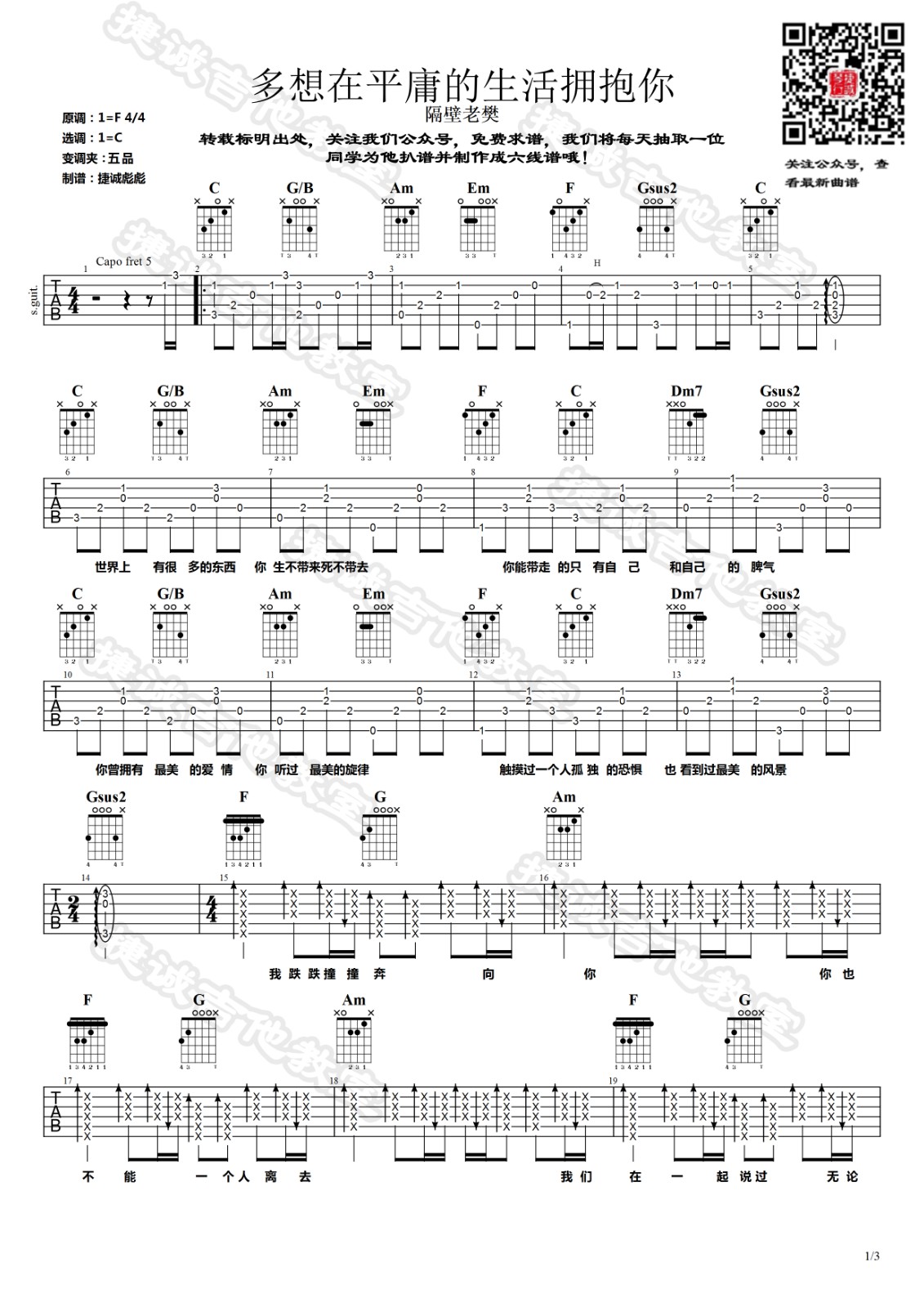 曲谱介绍: 隔壁老樊《多想在平庸的生活拥抱你》吉他弹唱谱,采用C调指法编配,鹤唳吉他教室编配出品,共有3张高清图谱。
