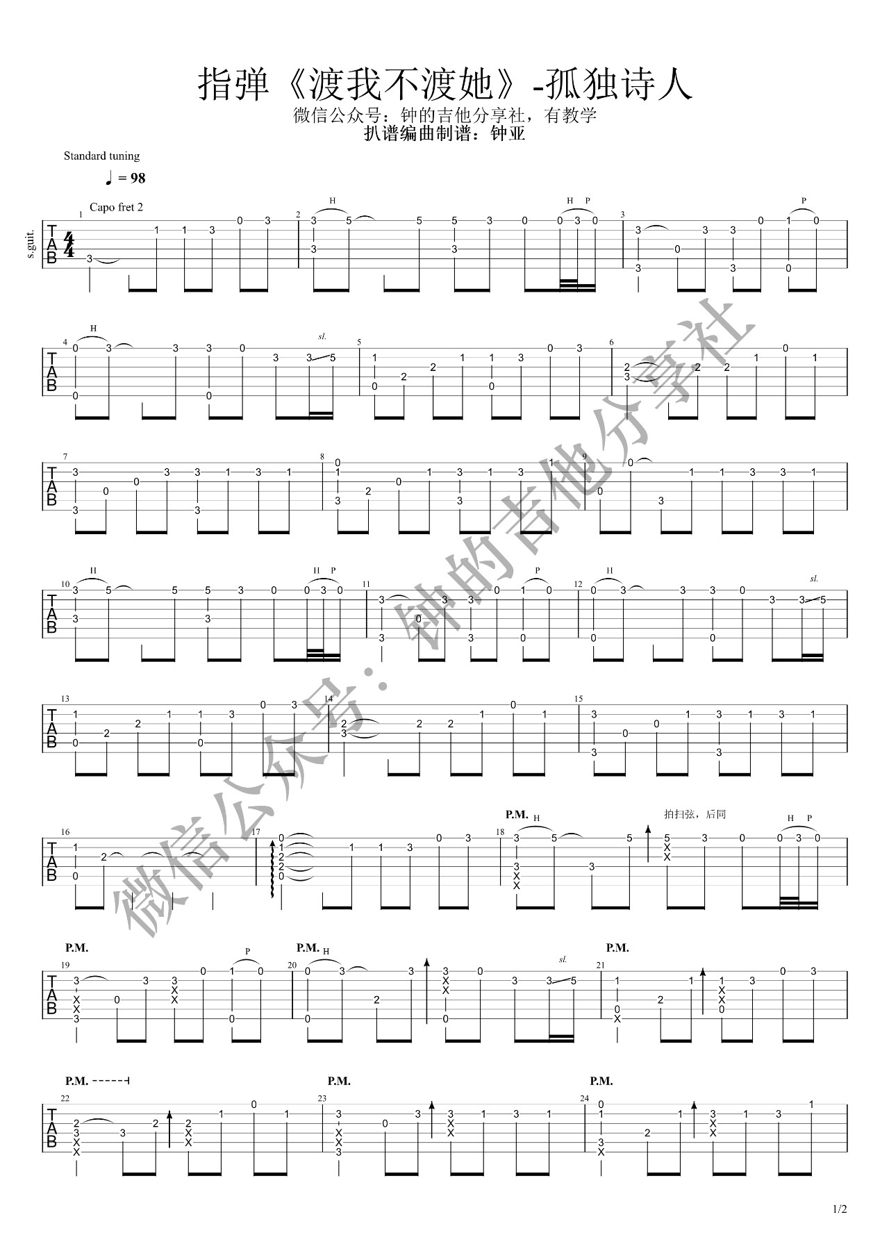 曲谱介绍: 附演示《渡我不渡她》吉他独奏谱,钟亚编配出品,共有2张高清图谱,免翻页排版设计。