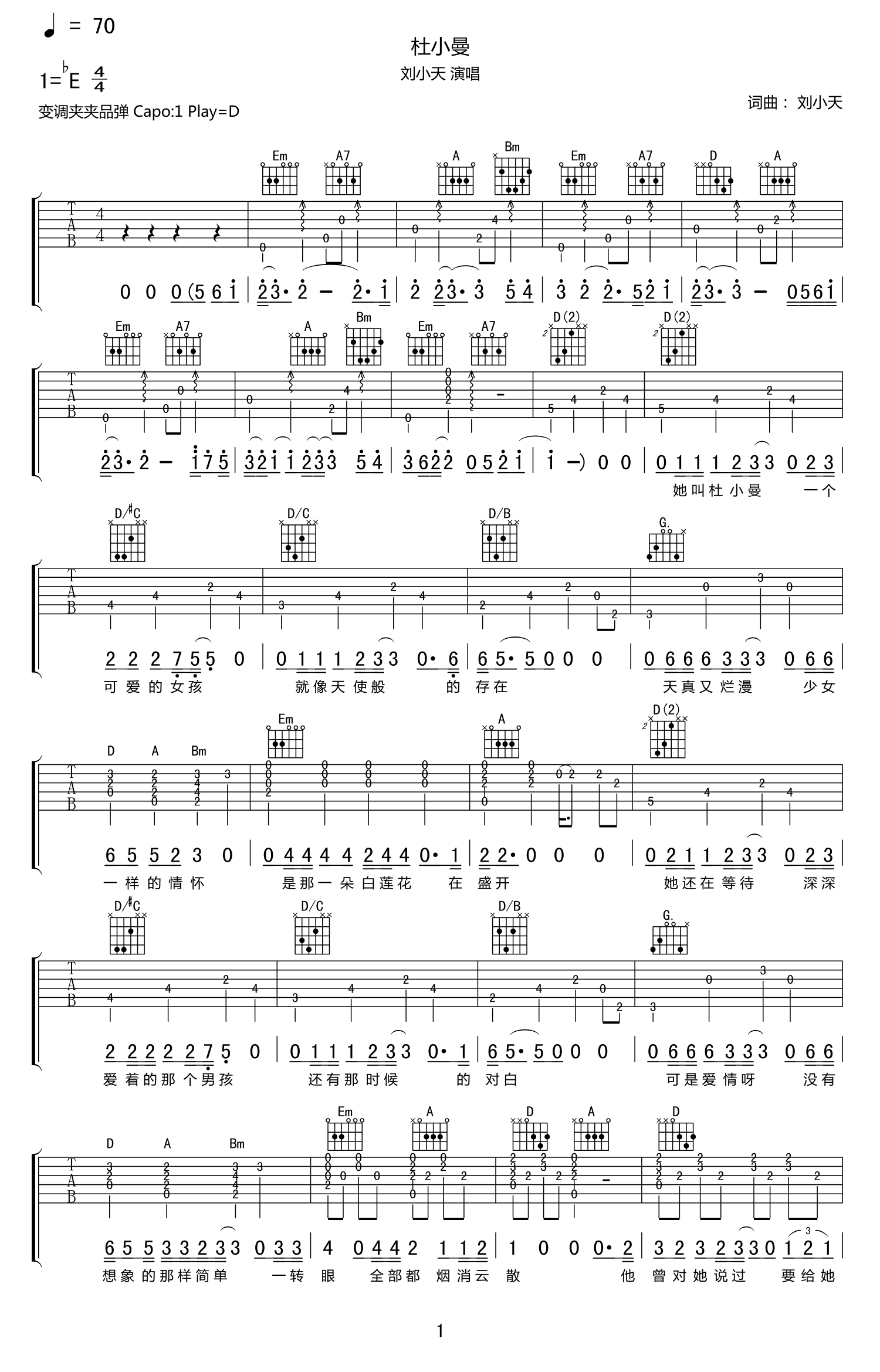 杜小曼吉他谱 - 刘小天 - D调吉他弹唱谱