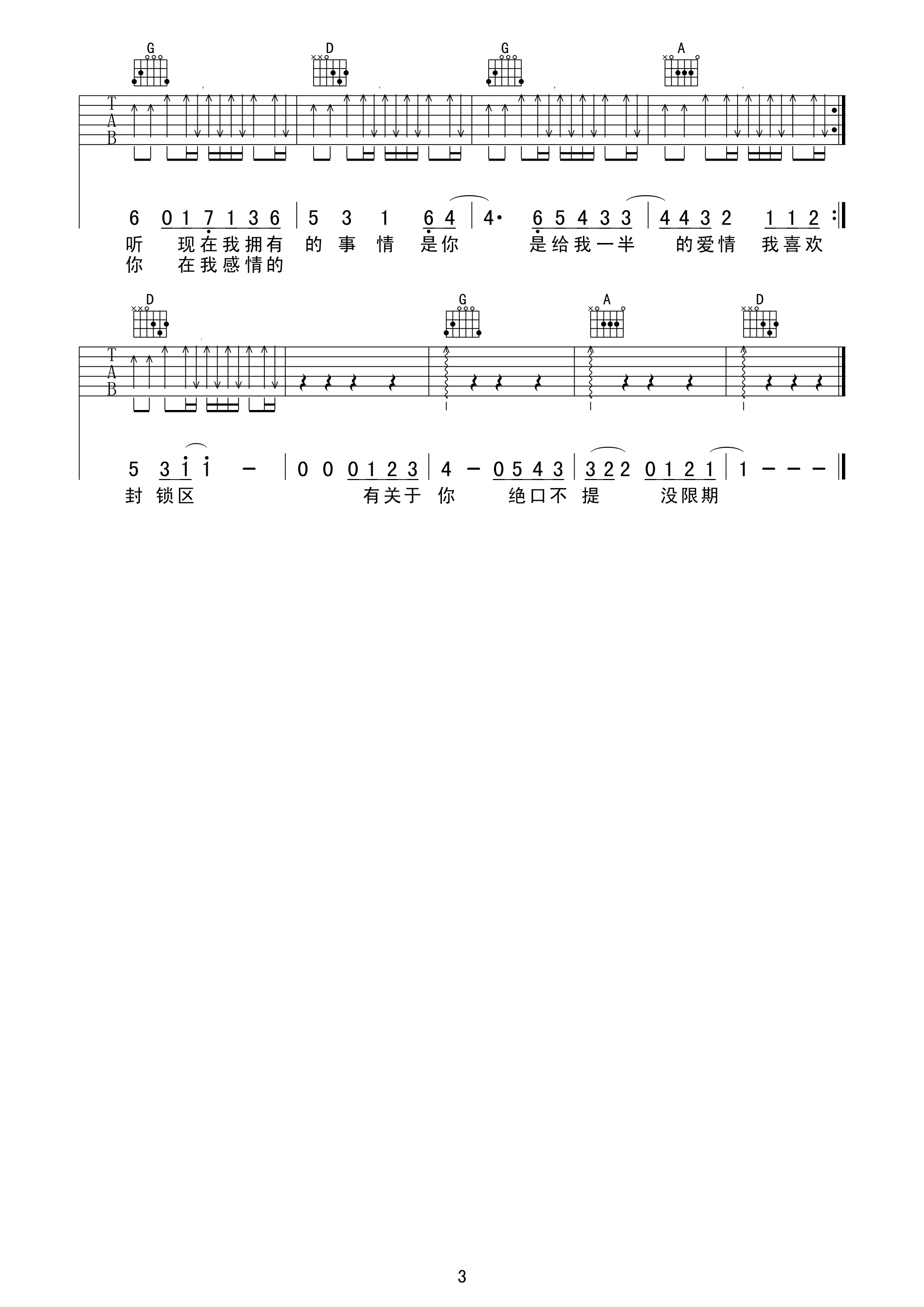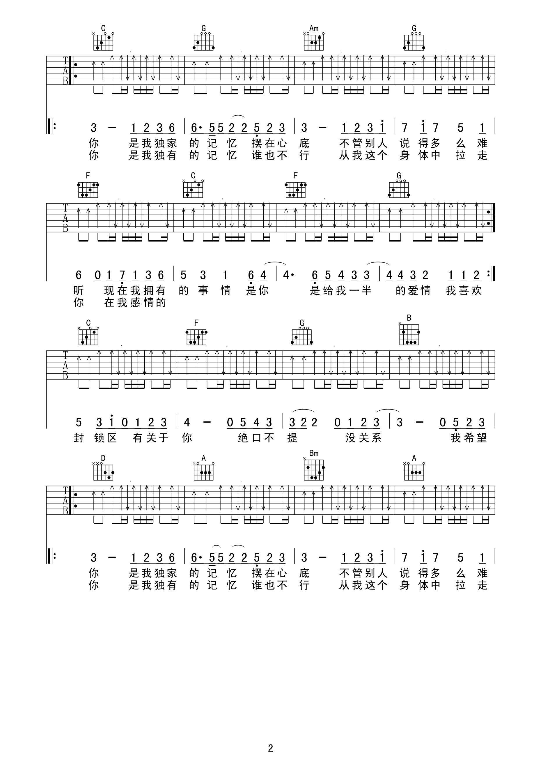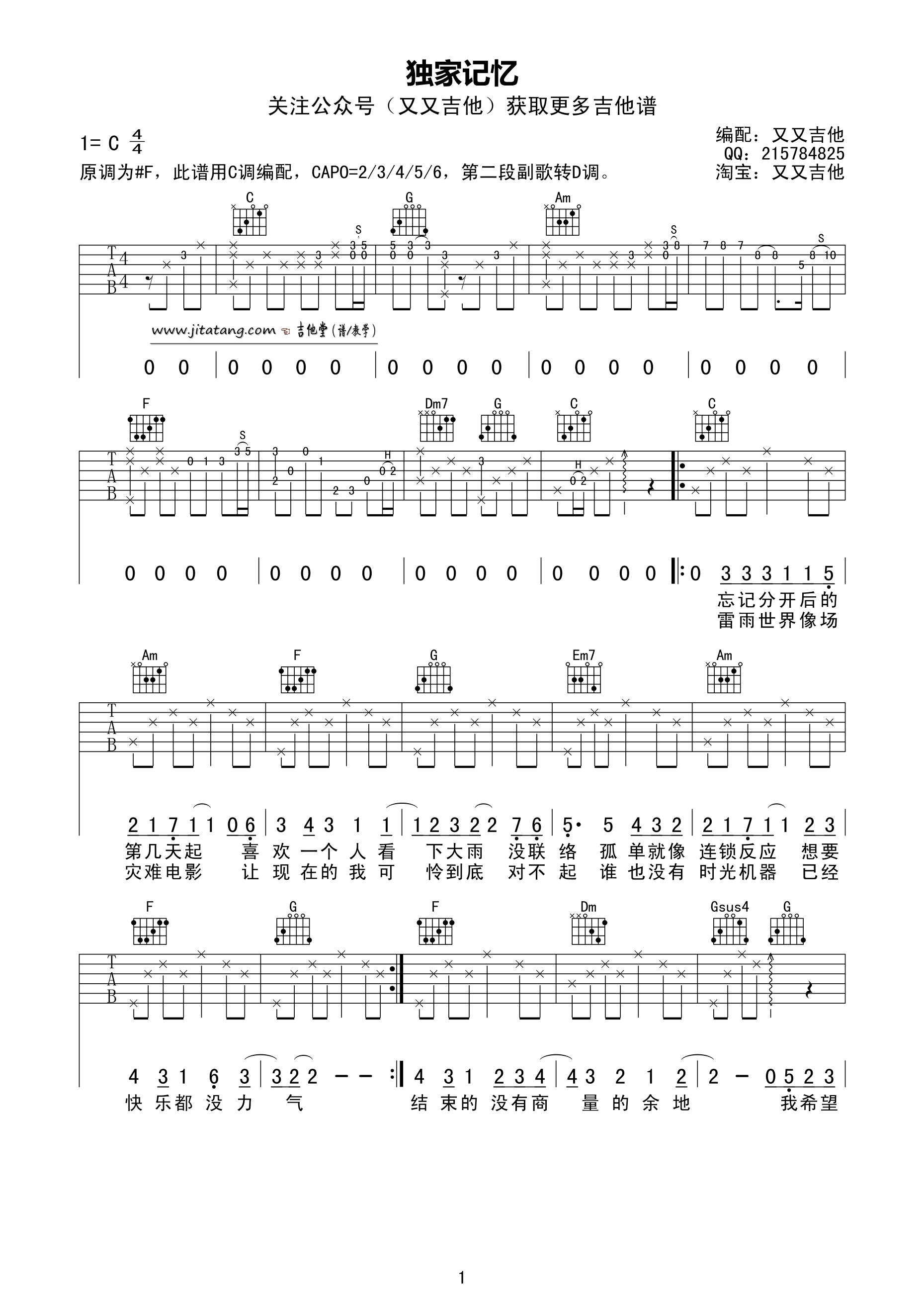曲谱介绍: 陈小春《独家记忆》吉他弹唱谱,采用C调指法编配,又又吉他编配出品,共有3张高清图谱。