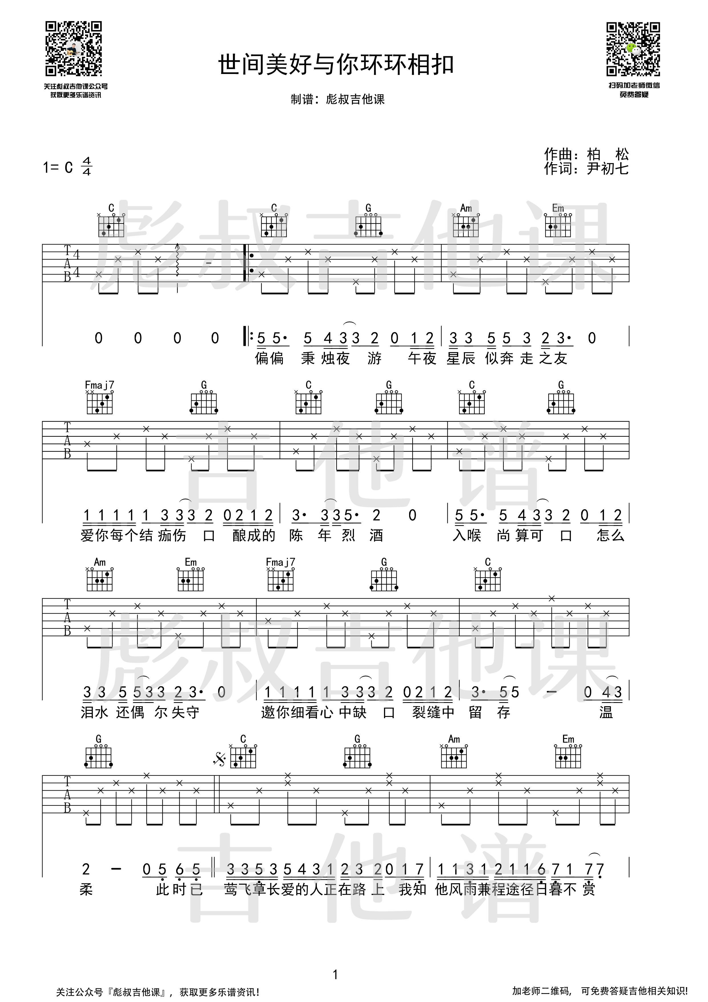曲谱介绍: 柏松《世间美好与你环环相扣》吉他弹唱谱,采用C调指法编配,共有2张高清图谱,免翻页排版设计。