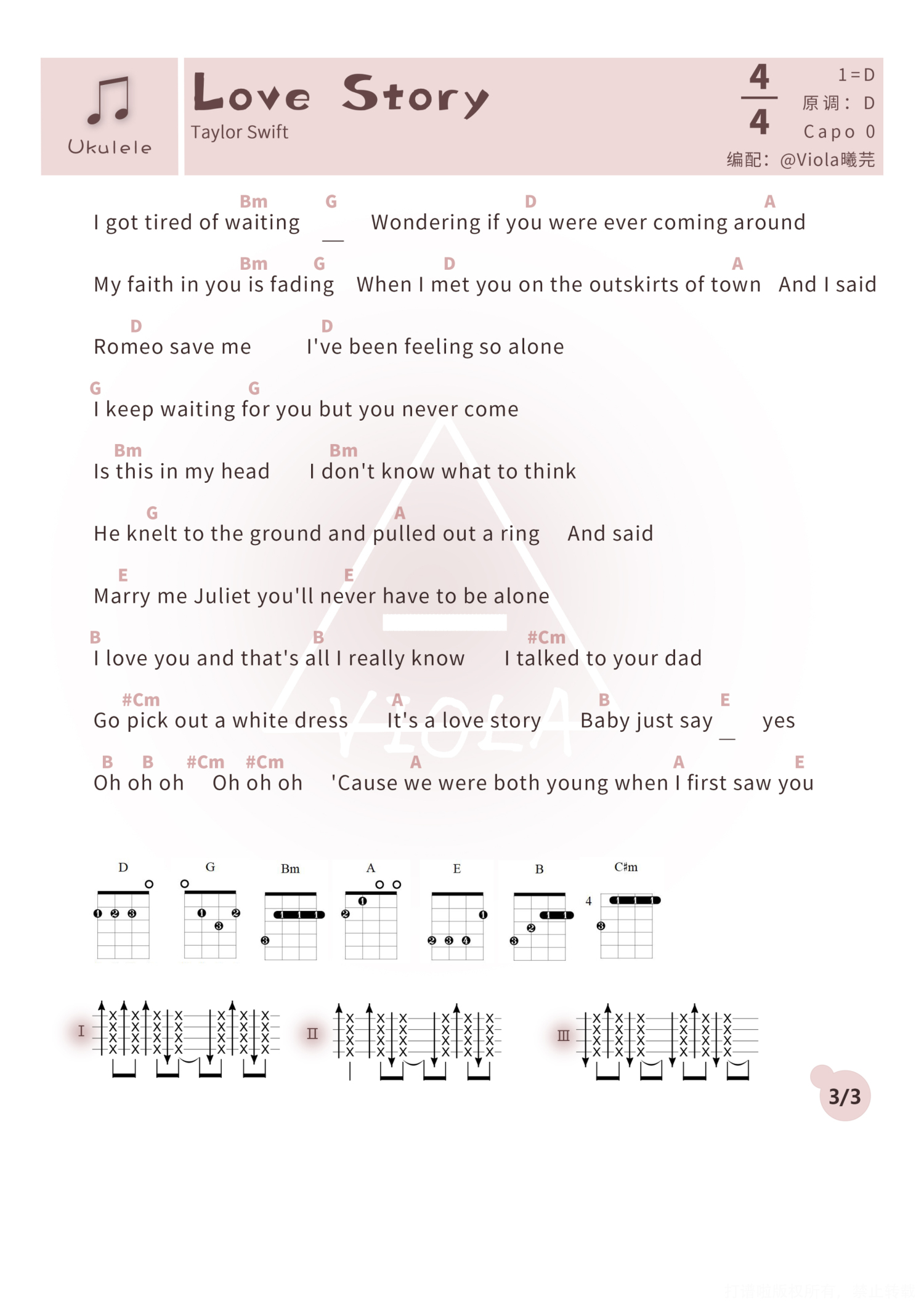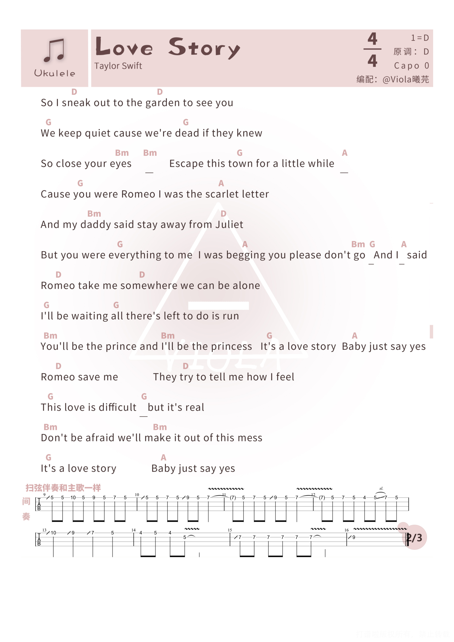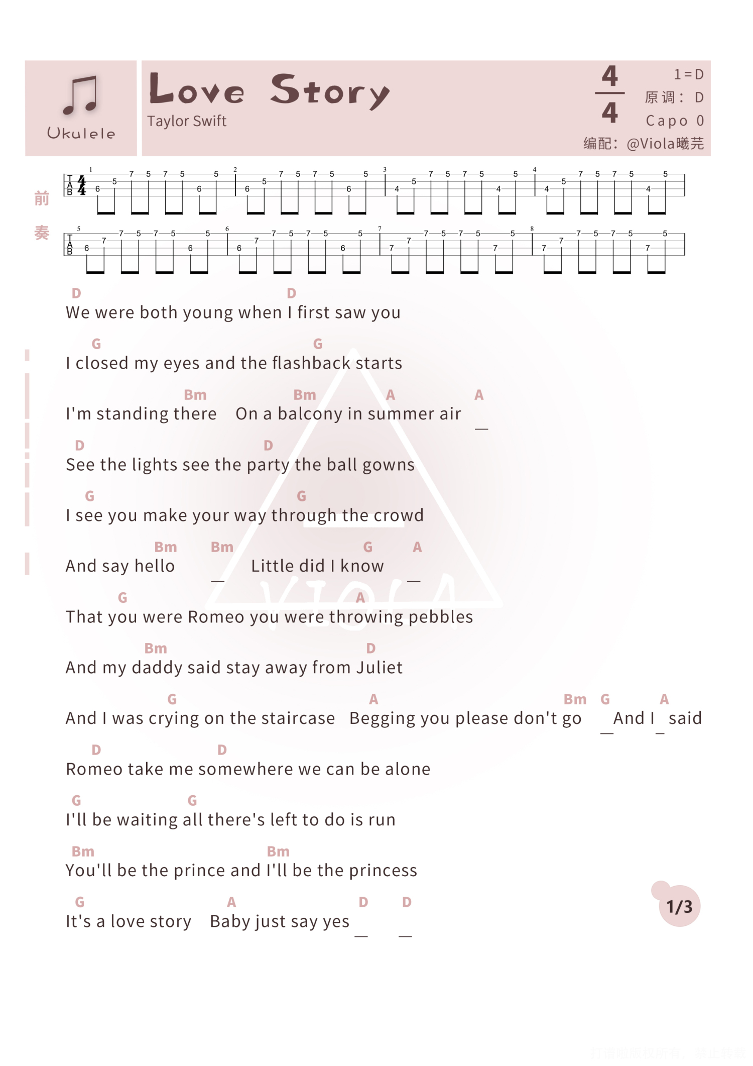 曲谱介绍: 刚录完"回忆杀"一波后,霉霉第二天就出了新歌Me! 这波不亏,先继续来一波回忆杀 话说新歌的MV看了吗!超级炫酷,彩蛋多多! 特别是蝴蝶的元素,是否对应着1专的蝴蝶呢? 这首Love Story是把原本悲剧的罗密欧与朱丽叶的故事,加入了霉霉自己的美好向往,也就是最后一段,罗密欧说服了朱丽叶的老豆,顺利向朱丽叶求婚!其实写的也就是霉霉以前和一个不被她老豆看好的男生在一起时候的故事。 相信灰常多的霉粉都是听这首歌入坑的吧,不知道新专是不是霉霉也要来一波回忆杀?!回归一下old霉?