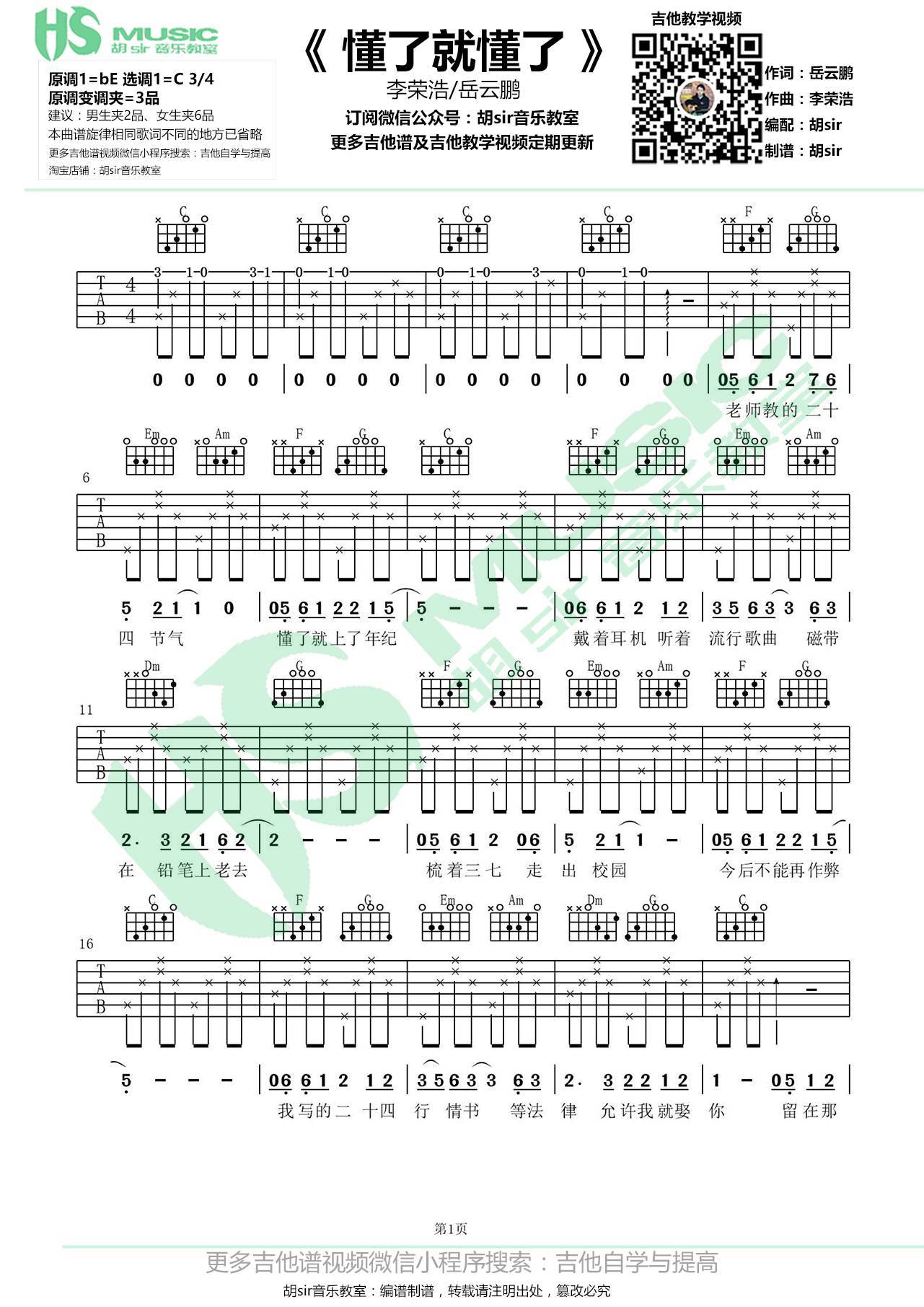 曲谱介绍: 李荣浩《懂了就懂了》吉他弹唱谱,采用C调指法编配,胡sir吉他教室编配出品,共有2张高清图谱,免翻页排版设计。