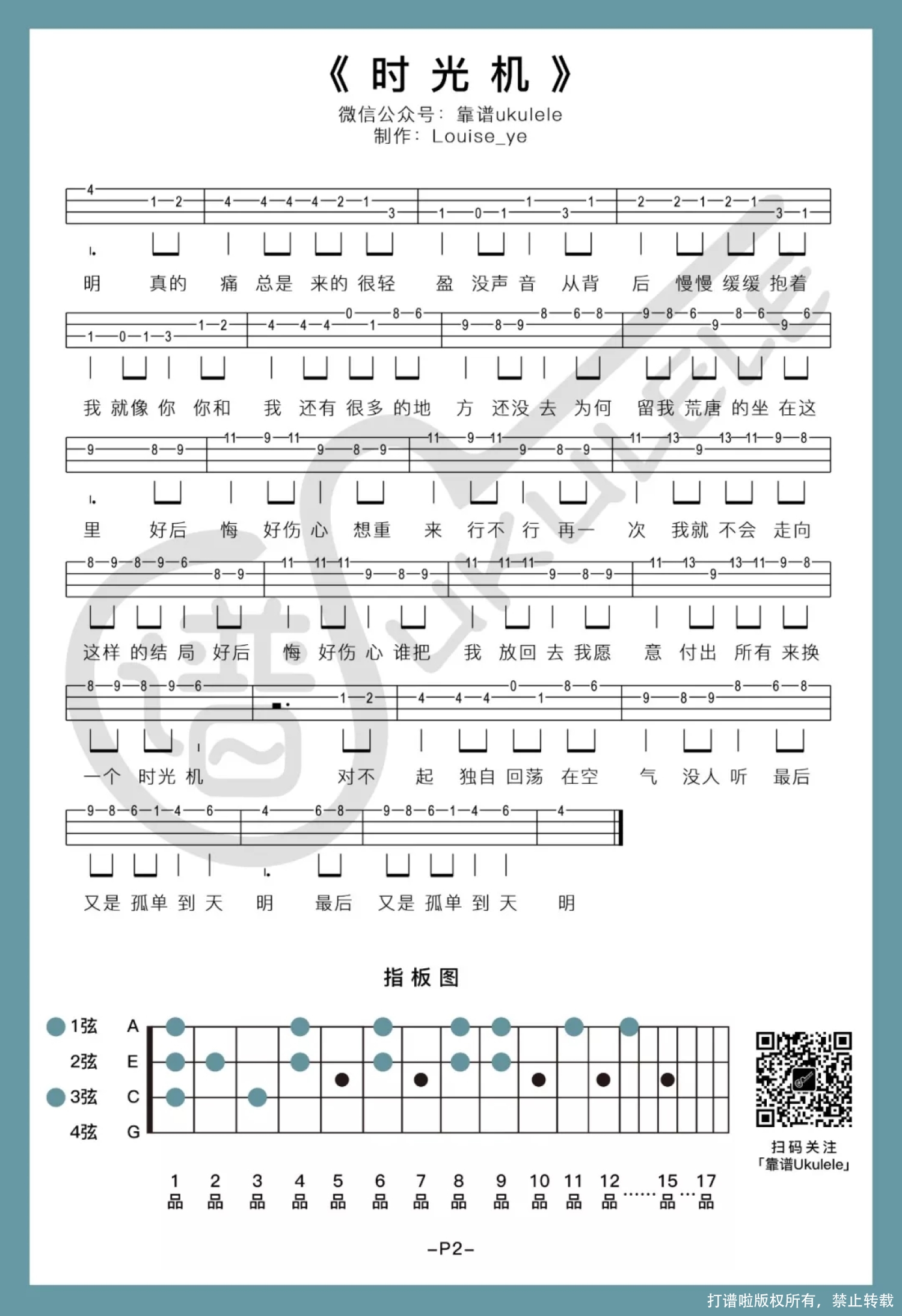 曲谱介绍: 一调整好单音部分就来分享啦~ 不久前也有分享了《时光机》的弹唱谱,有需要的朋友可以点击查看→《时光机》弹唱谱←。   难度系数:★ ★ 光是看开始的部分相信很多人都会觉得很容易。但是如果你看到了下方的指板图显示,你就会发现这次的单音谱使用到了指板后半截的部分,我刚做好谱的时候自己弹都有些不是很灵活,指法也是反复调整才确定下这个版本。 那么,是哪个部分会觉得有点不灵活呢? 从歌词“好后悔……”一直到“……来换一个时光机”,就是Louise觉得相对有点难度的部分,单音使用到了之前出现的很少的11品与13品,所以在练的过程中建议,先考虑清楚指法要怎么按。当然指法如果觉得不合适,你们也是可以自己尝试调整的(参考调整图在谱最下方)。 由于这次谱比较长,分了两页,如果有亲爱的要保存谱的话,别粗心哟!   「时光机」指弹谱