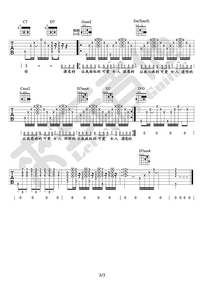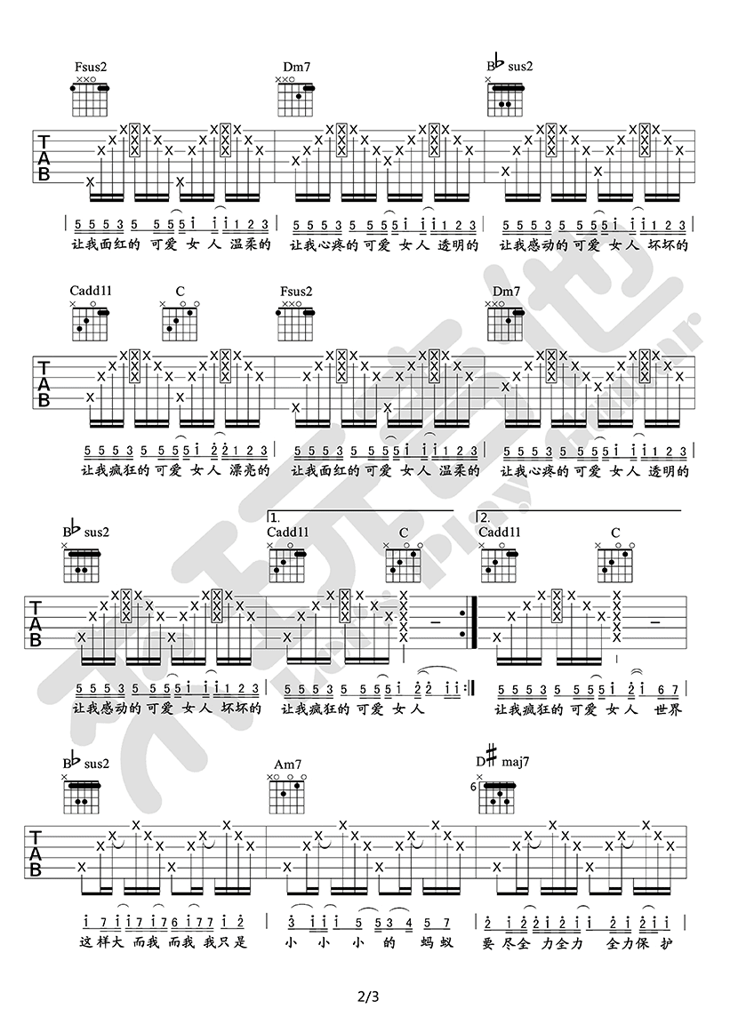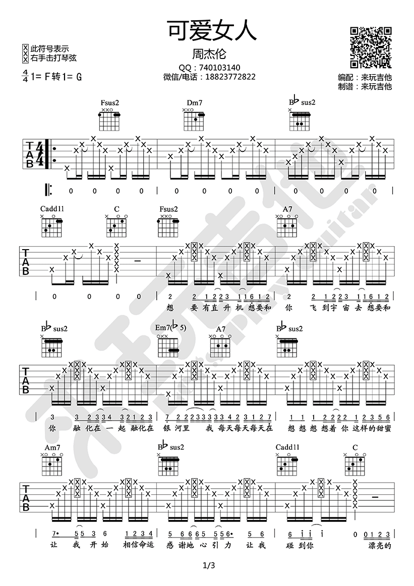 曲谱介绍: 周杰伦《可爱女人》吉他弹唱谱,采用F调指法编配,来玩吉他编配出品,共有3张高清图谱。